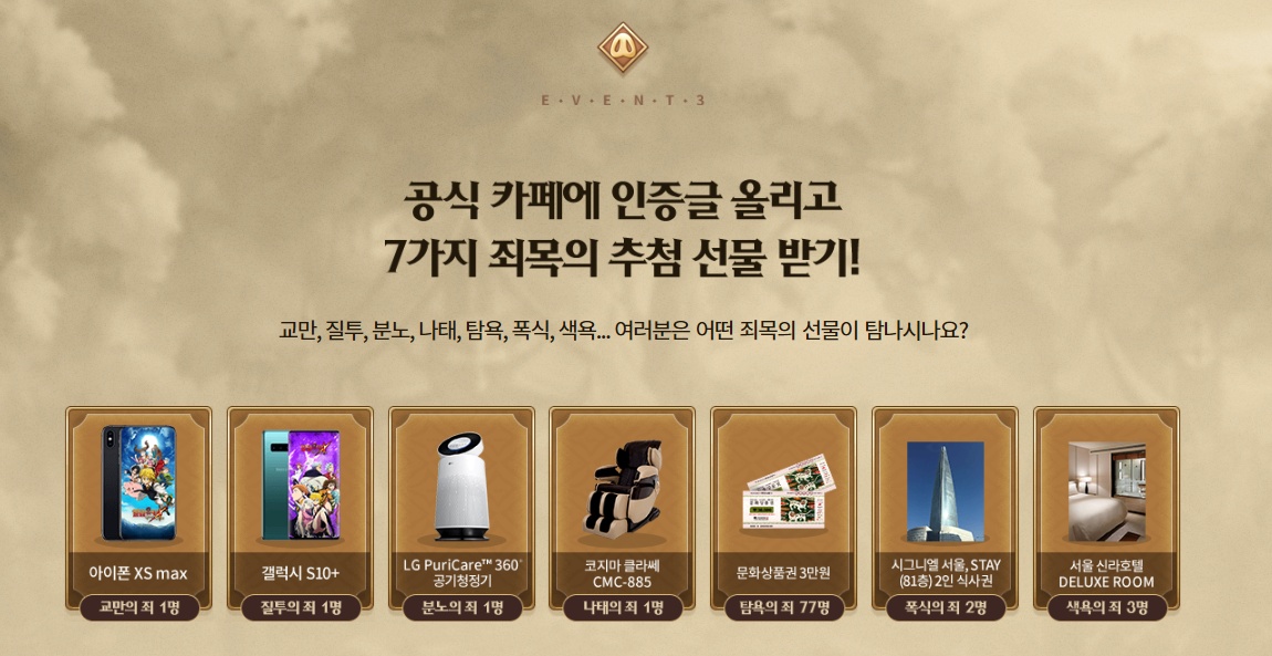 공식카페 가입 이벤트 외에도 인증글을 올리면 추첨을 통해 아이폰XS max를 비롯해 갤럭시S10+, LG 공기청정기, 안마의자등등 여러 푸짐한 선물들이 준비되어 있는 만큼 원하는 선물이 있다면 넷마블 대작RPG 일곱개의대죄 그랜드크로스에서 진행중인 이벤트에 참여 선물의 주인공이 되어보세요!!