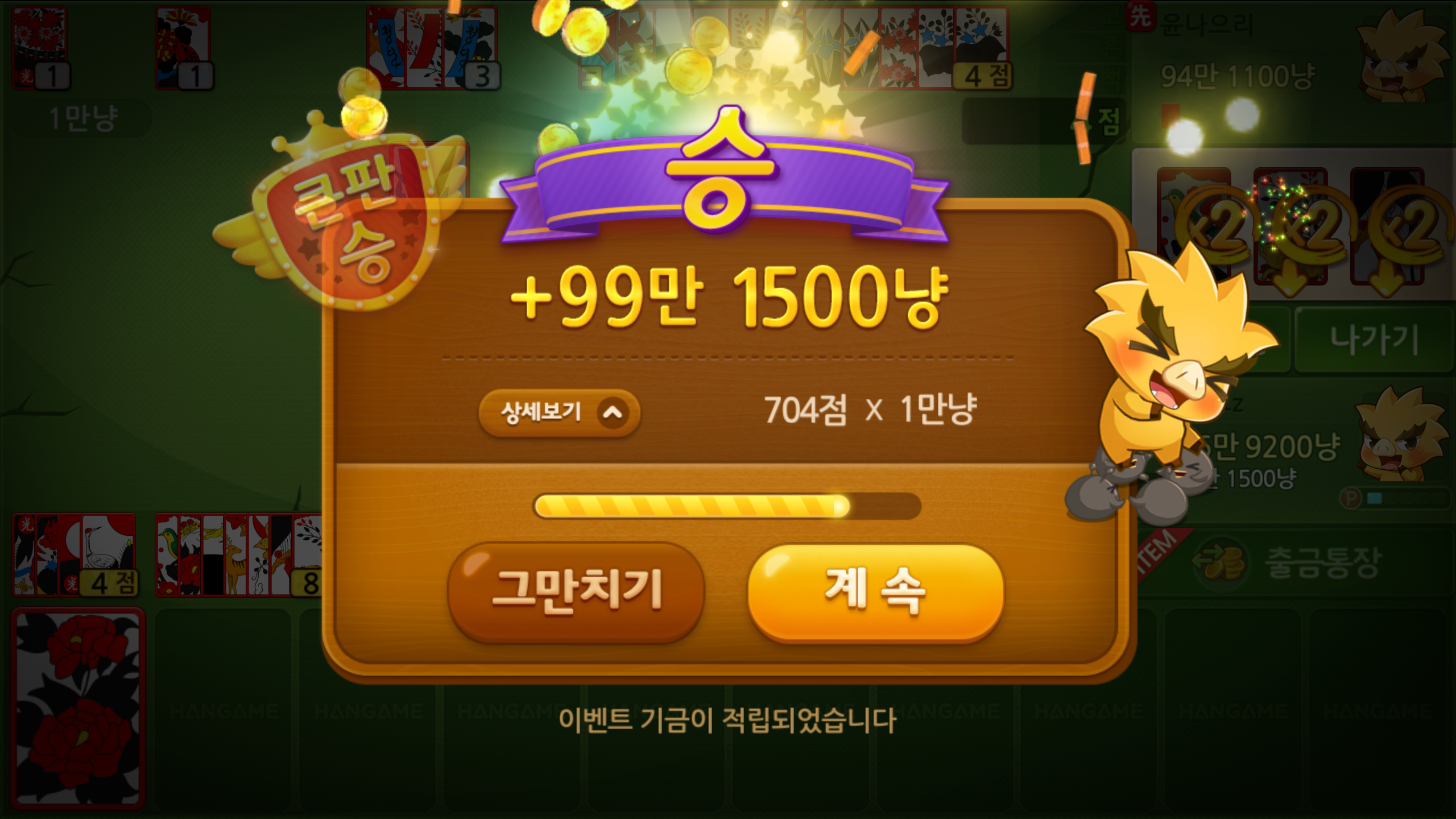 결국 한게임신맞고를 즐기면서 좀처럼 오지 않는 큰판의 승자가 되었습니다. 중간에 위험한 순간도 있었지만 힘들이지 않고 잘 헤쳐나간것 같아 내심 뿌듯하더군요. 반대의 경우도 자주 일어나지만 이렇게 크게 이기는 순간의 짜릿함 때문에 계속 즐기고 있는 것 같습니다.