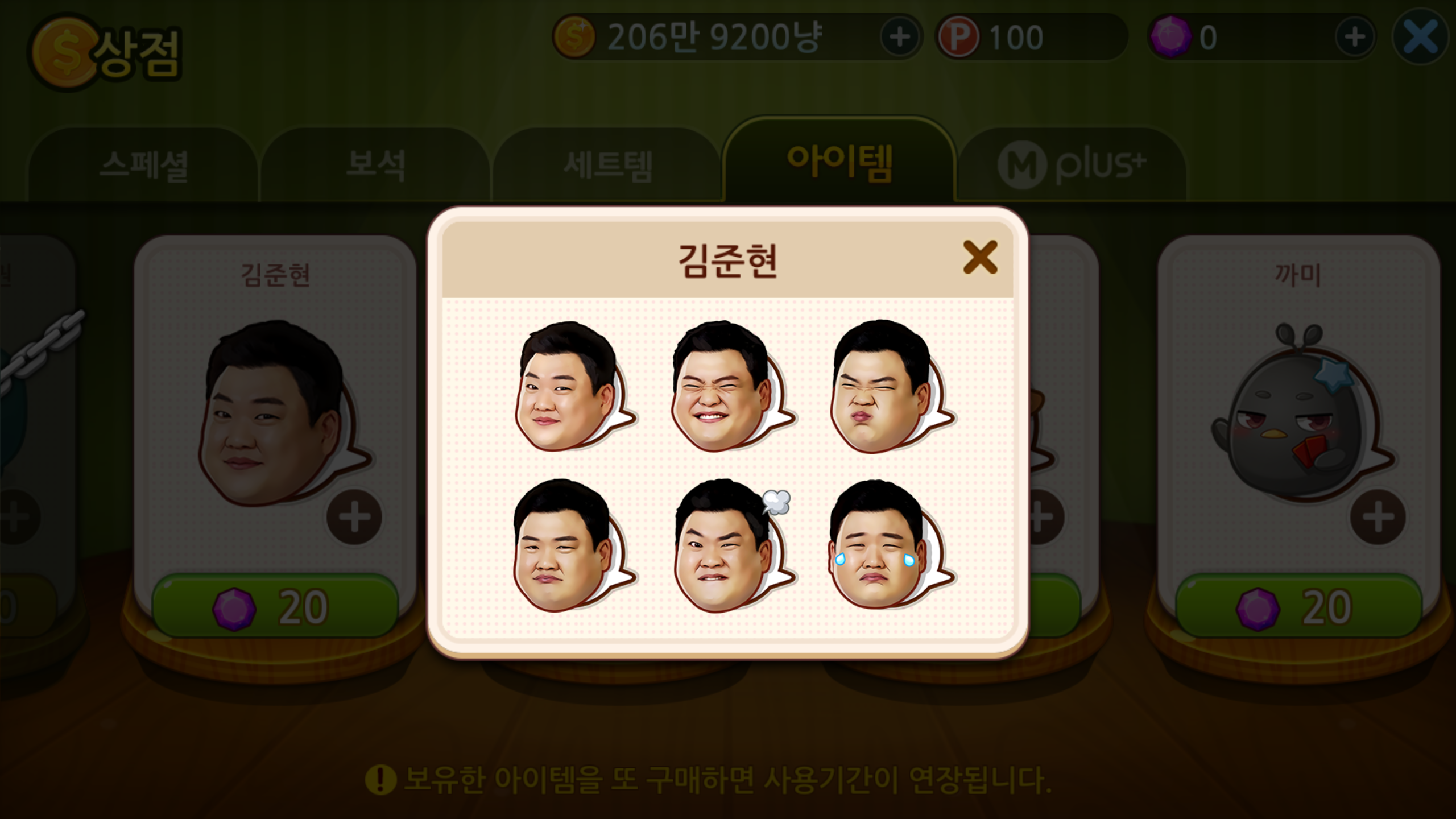특히 상점에서 김준현 이모티콘을 체험할 수 있는 이벤트도 진행 되고 있어 특유의 표정들을 만나볼 수 있습니다. 어느 표정하나도 그냥 버릴수 없을 만큼 마음에 쏙 드는건 김준현 특유의 재치 넘치는 표정들을 담고 있기 때문인데요, 플레이 도중 상대를 향해 하나씩 날리는 재미도 가지고 있습니다.