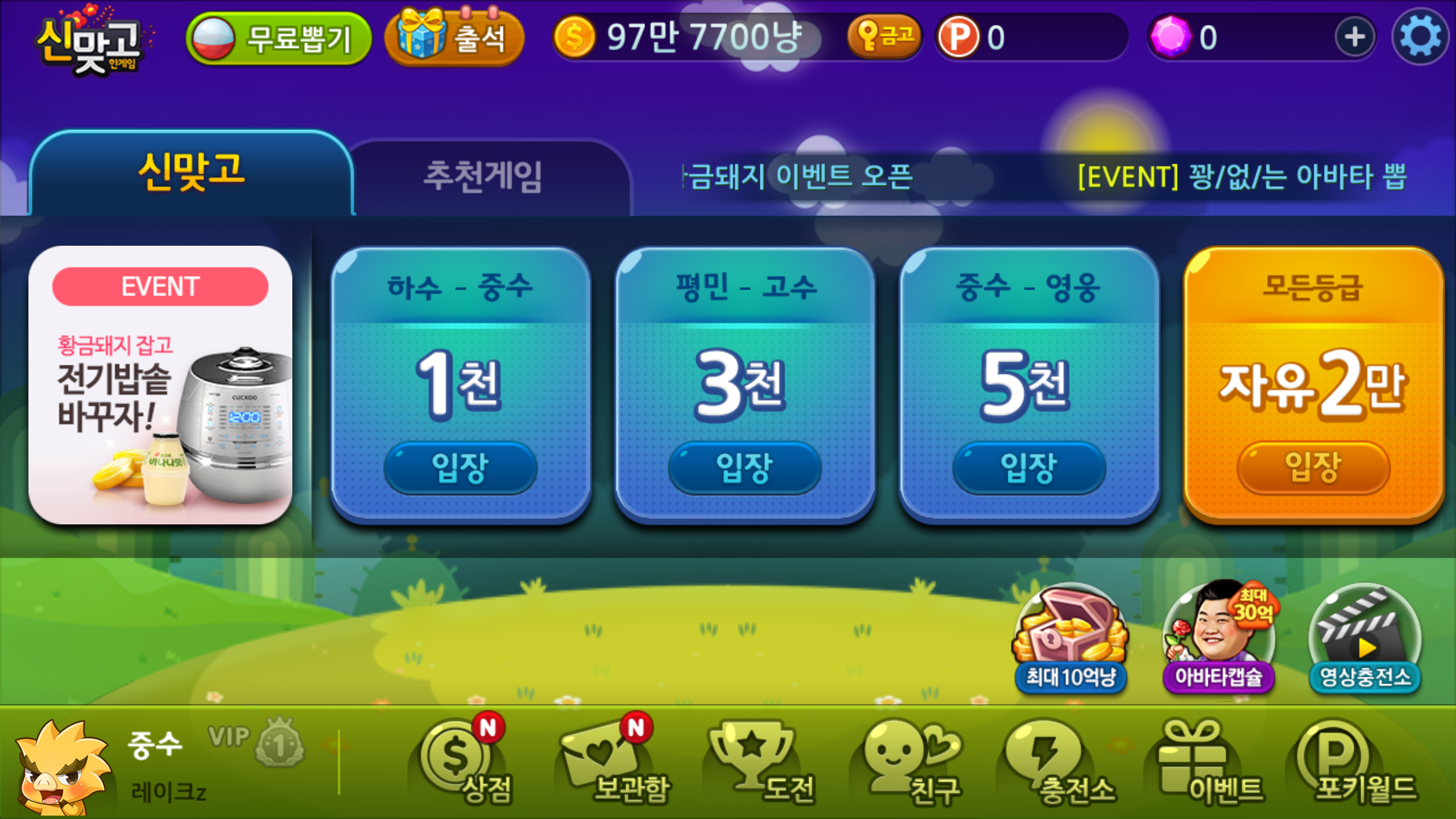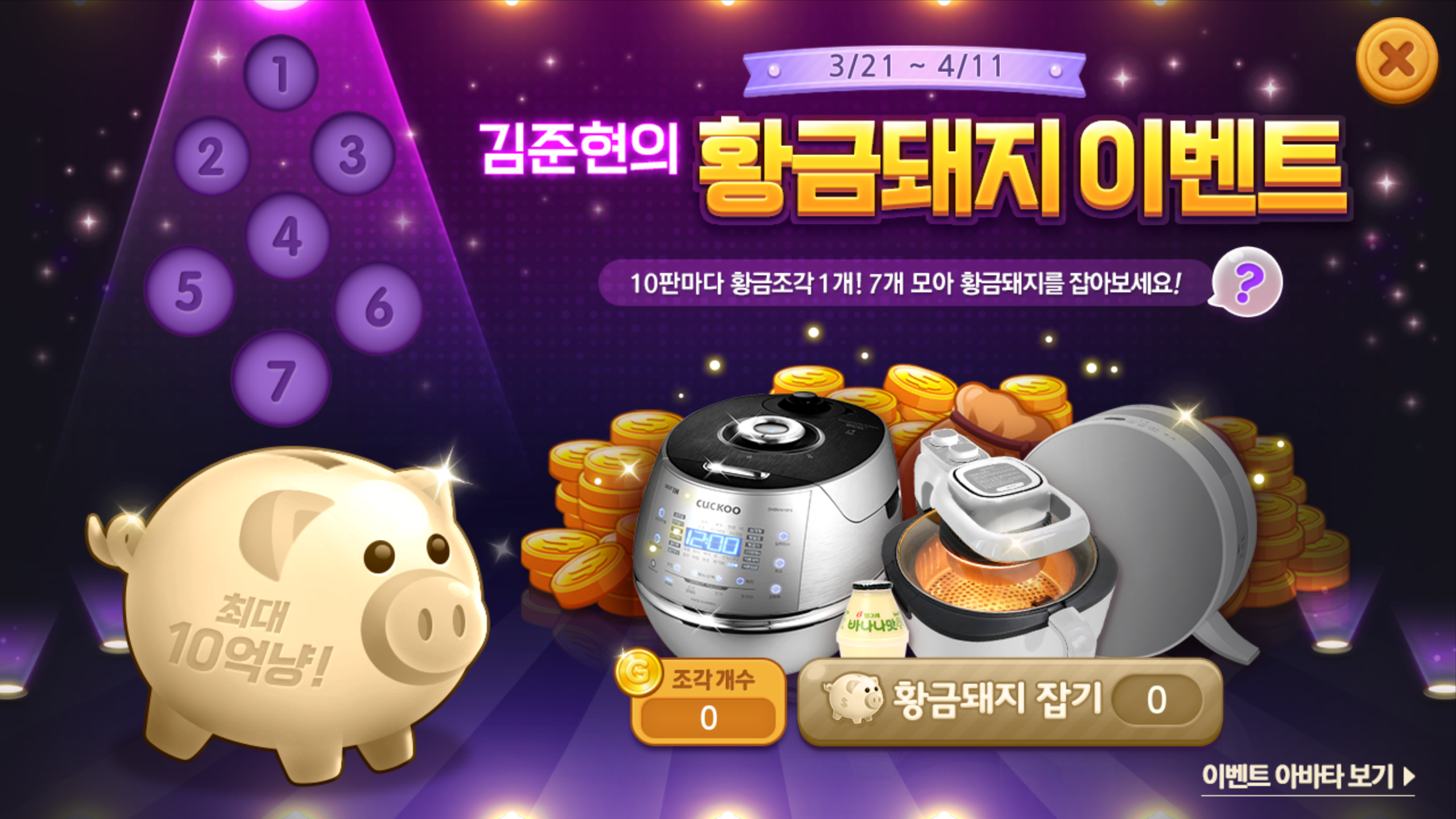 짧은 시간 짜릿함을 가져다 주는 한게임신맞고. 김준현을 모델로 내세운 이벤트도 진행 중입니다. 게임만 즐기면 획득 가능한 황금조각을 7개 모으면 여러 선물의 주인공이 될 수 있는데요, 황금돼지 이벤트 답게 갓 지은 맛있는 밥을 먹을 수 있는 밥솥까지 득템할 수 있으니 게임도 즐기고 선물도 챙기는 일석이조의 즐거움을 누려보세요!