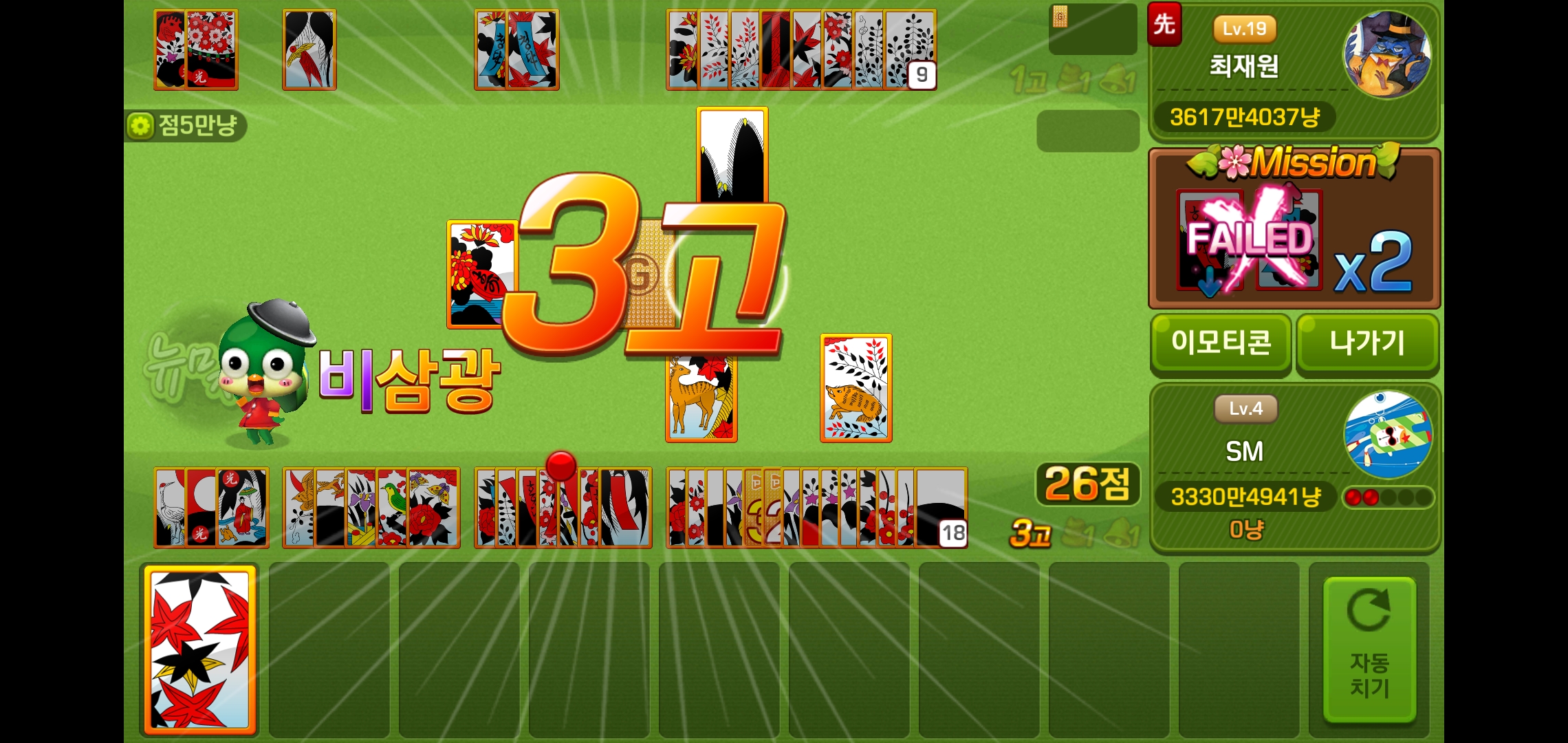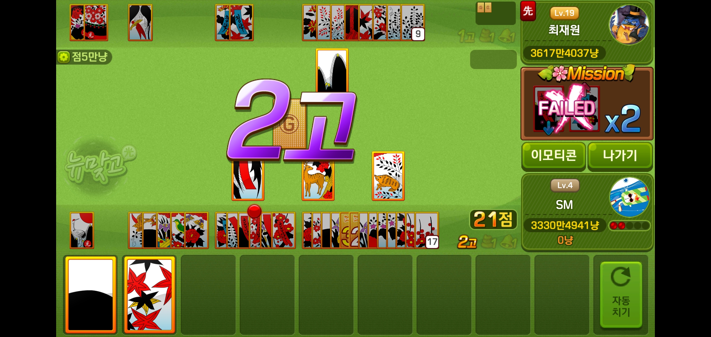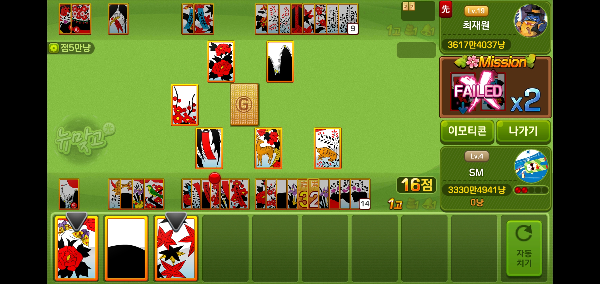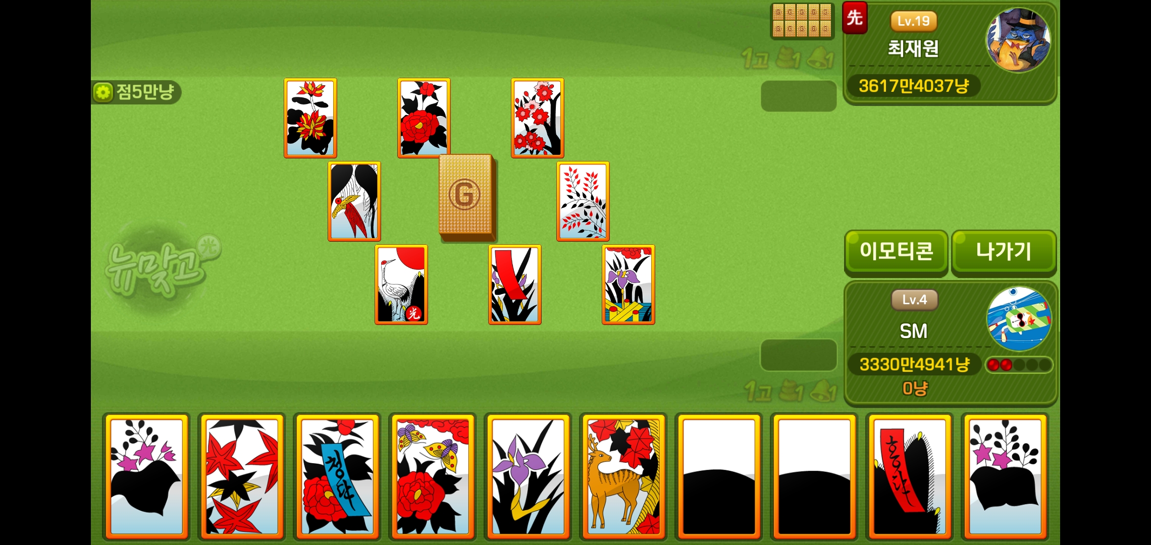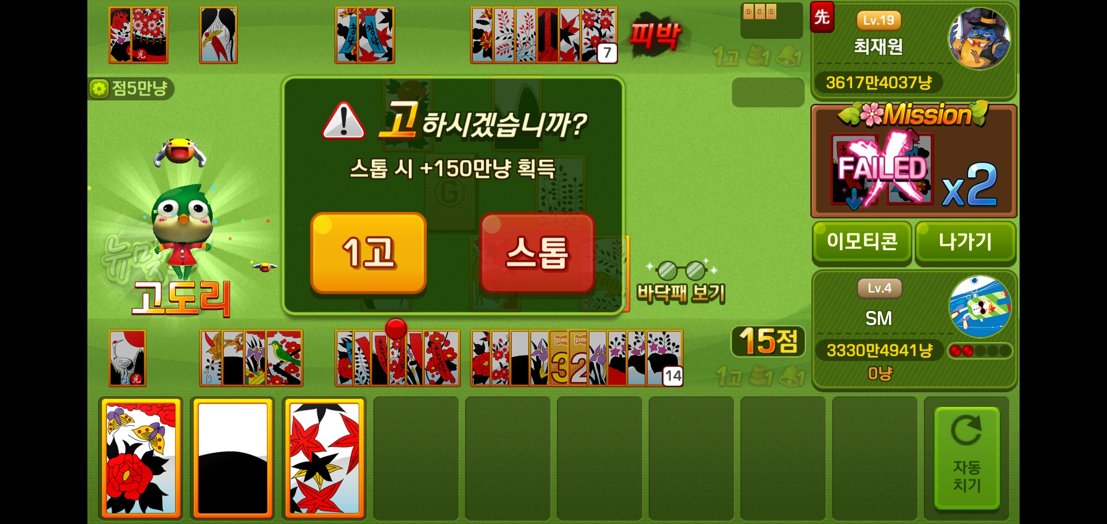 숨막히는 접전 끝에 고도리를 완성할 수 있었습니다. 여기서 더 할 것인지 아니면 그만할 것인지 여부를 판단해야 하는데 상대는 아무런 점수도 내지 못하는 상황이더군요. 더욱이 점수를 낼 수 있는 패가 바닥에 깔리거나 한 것도 아니어서 가볍게 1고!