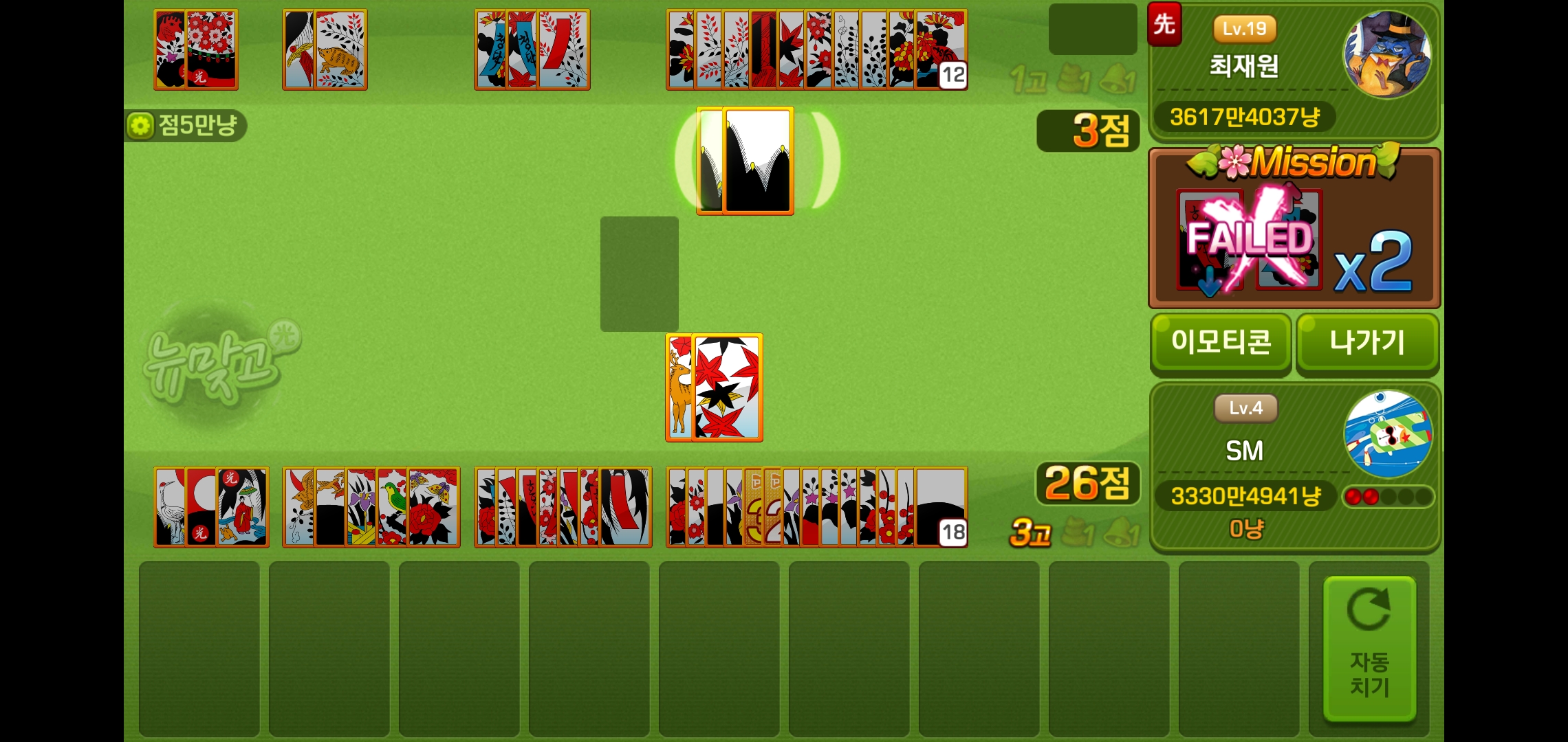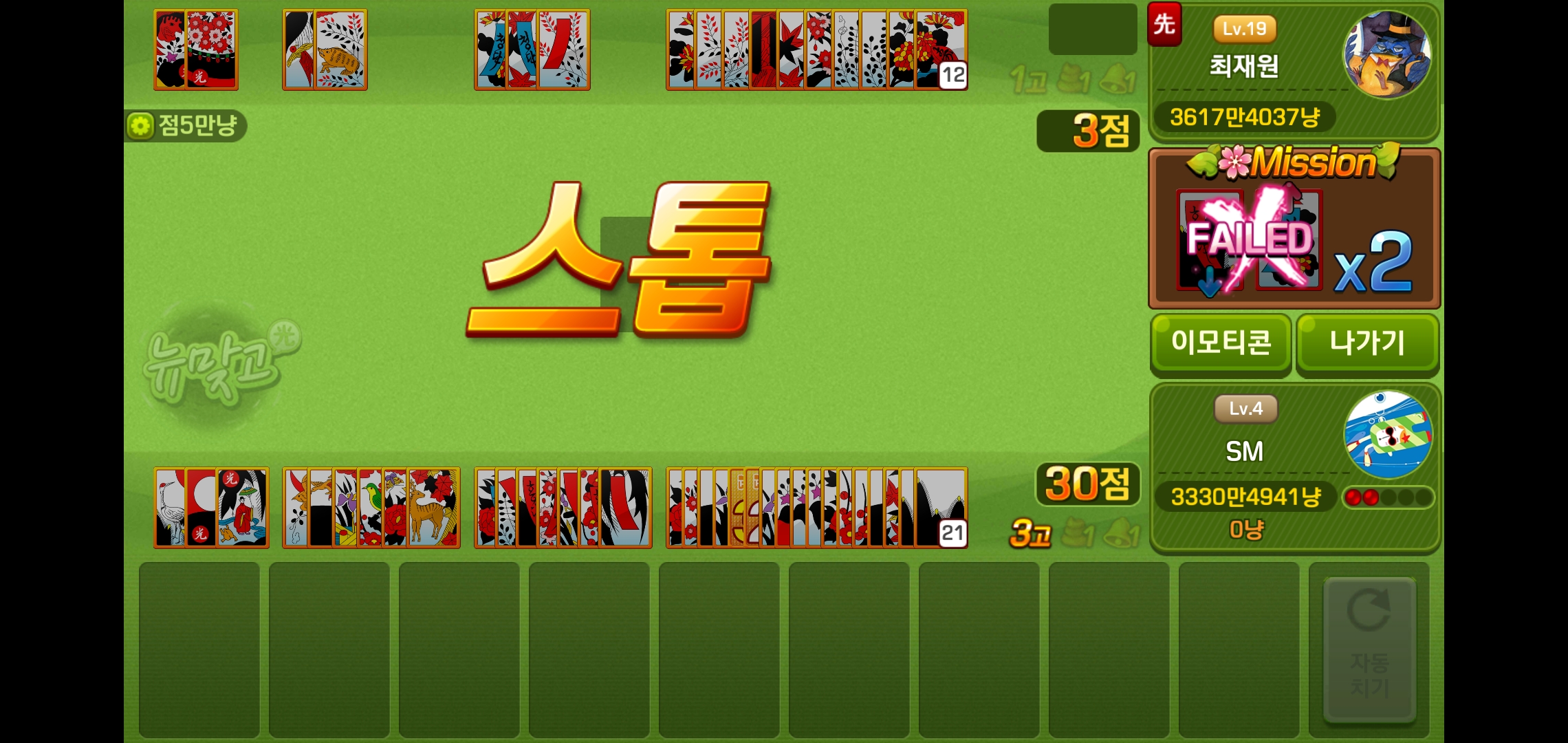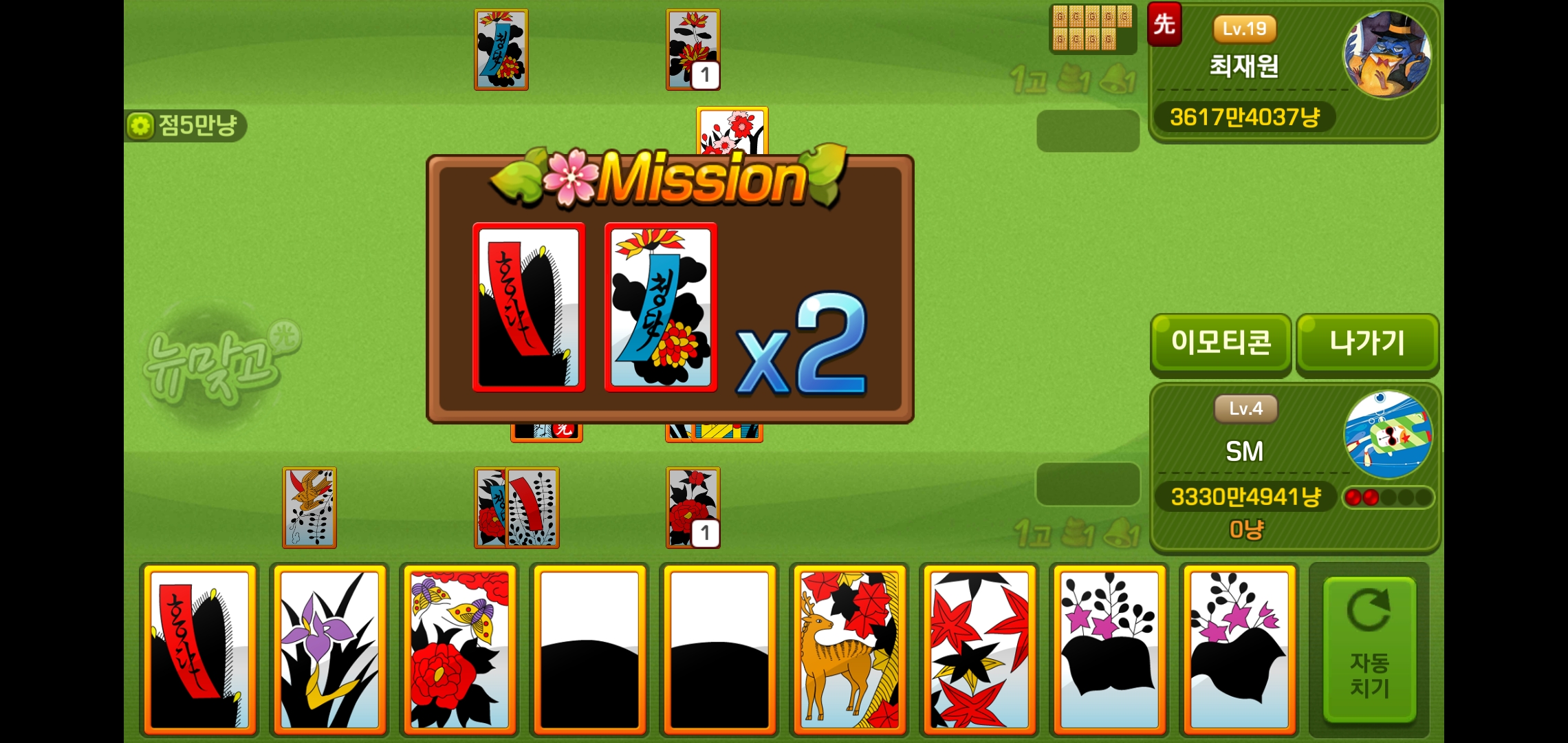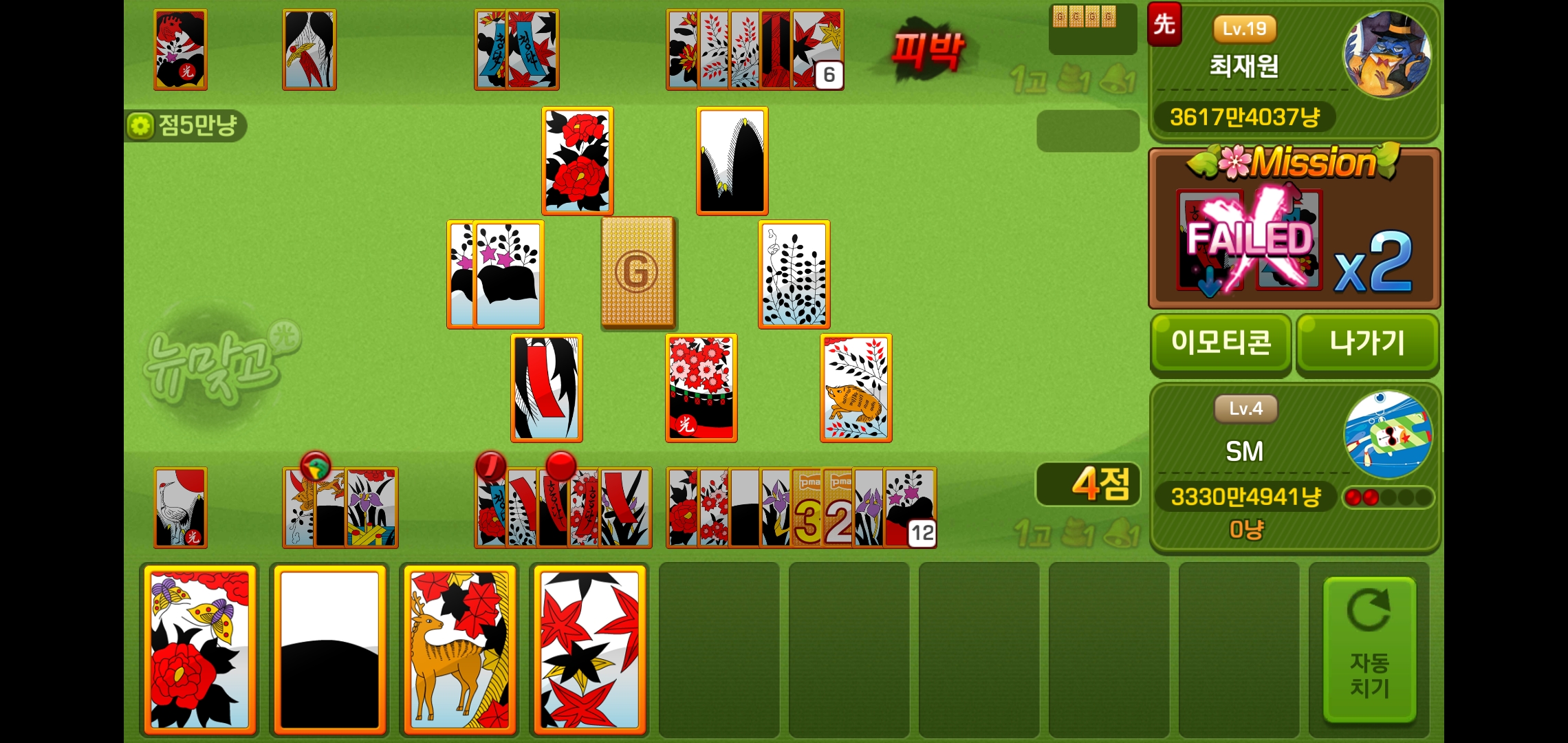 이번 경기의 두배 미션! 시작과 동시에 상대가 한장을 가져갔고, 나머지 한장은 보유하고 있는 상황이었기에 미션은 이미 완성되지 못한다는걸 알수 있었습니다. 만약 낮은 확률로 벌어지는 뻑이 벌어지지 않는다는 가정하에 말이죠.