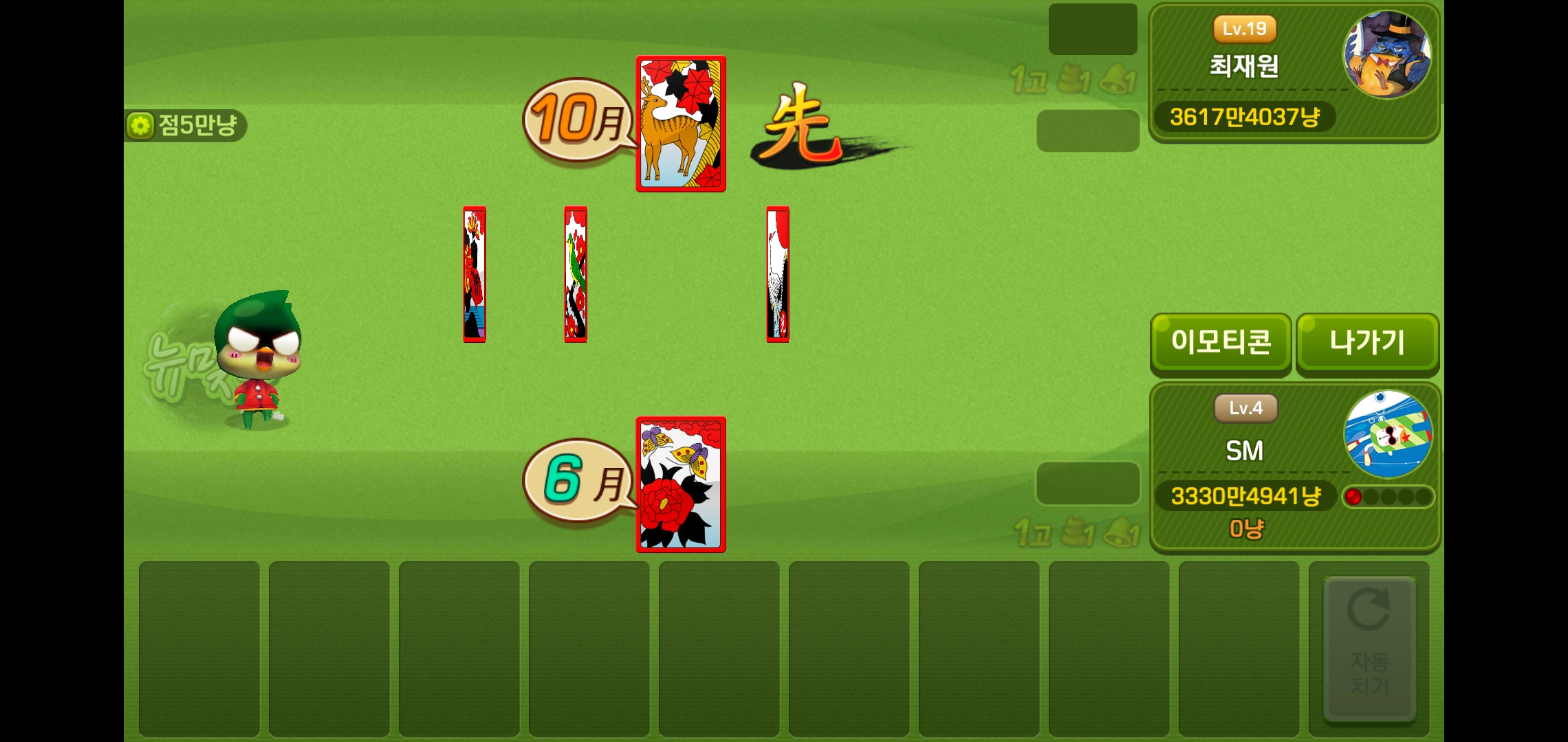 점5만냥 방을 선택하고 시작되는 경기는 왠지 모를 긴장감이 느껴지는데요, 선을 잡아야만 바닥에 깔린 조커를 가지고 올 수 있기 때문에 신중을 기하는 순간이기도 합니다.