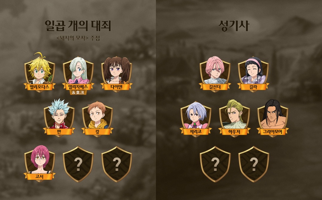 현재 공개된 인물들은 일곱 개의 대죄 멜리오다스와 엘리자베스&호크 다이앤, 반, 킹, 고서 그리고 성기사 길선더, 길라, 제리고, 하우저 마지막으로 그리아모어가 전부인데요, 실제 인게임에서는 이외 인물들이 추가되어 모험을 함께 즐길 수 있을 것으로 보여집니다.