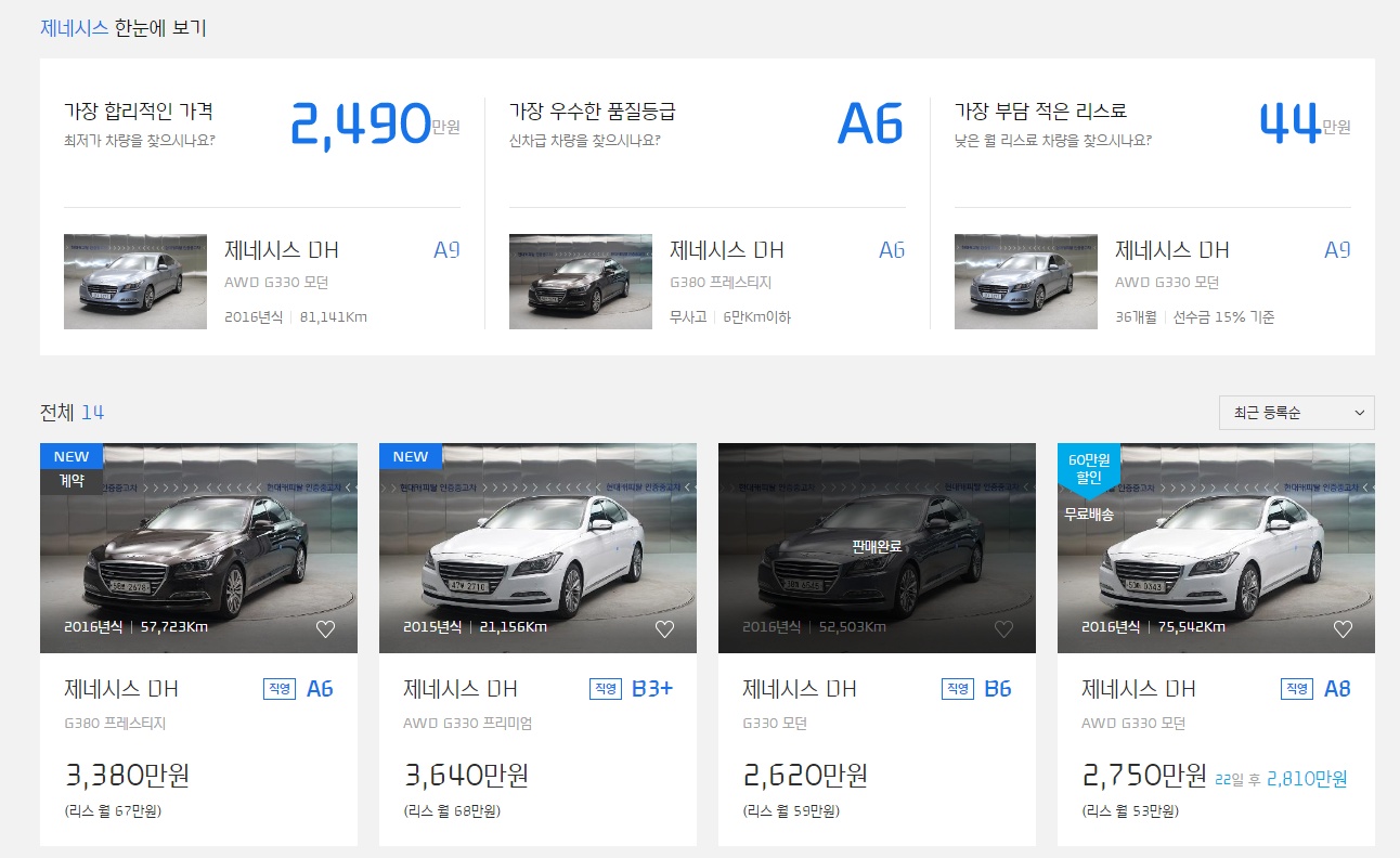 제네시스를 선택하니 가장 합리적인 가격으로 구매 가능한 매물부터 우수한 품질등급. 부담 적은 리스료에 대한 차량부터 시작해 새롭게 매물로 등록된 차량까지 한눈에 확인할 수 있었습니다.