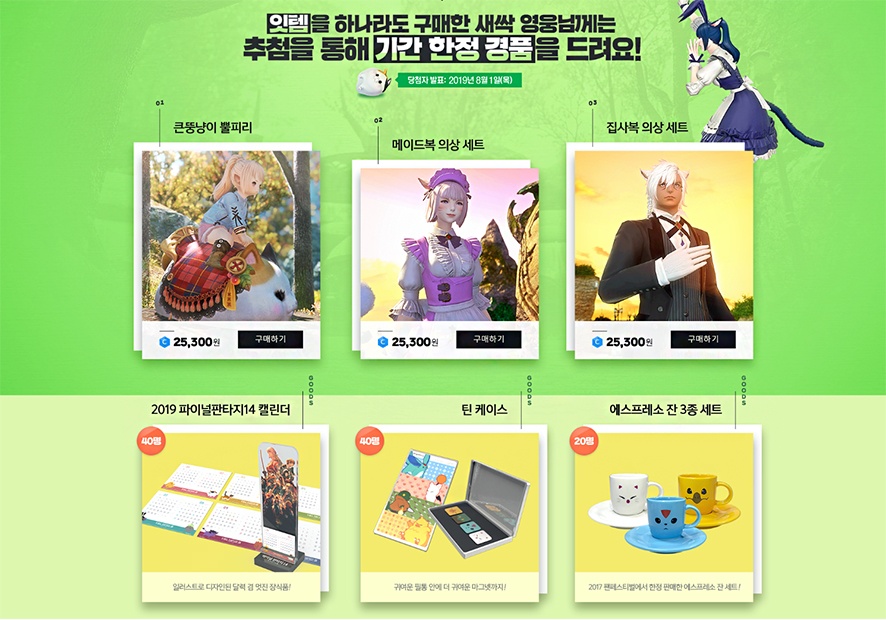 이벤트 기간내에 잇템이라고 일컫는 큰뚱냥이 뿔피리나 메이드복 의상 세트, 집사복 의상 세트를 하나라도 구입한 유저라면 추첨을 통해 기간 한정 경품을 제공합니다. 경품은 파이널판타지14 굿즈제품으로 구성되어 있어 굿즈에 따라 잇템 구매를 진행해도 좋을 것 같습니다.