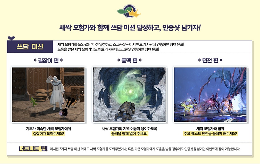 그 밖에도 신규유저를 도와 미션을 완성하고 함께 이미지를 촬영 멘토 게시판에 올리는 이벤트도 진행되고 있습니다. 아무래도 처음 진행하는 유저의 경우 잘 모르는 부분들이 있는 만큼 먼저 즐기고 있는 유저들의 도움이 필요한 경우가 많은데요, 기존 유저는 신규유저를 도와주고 이벤트에 참여 보상을 받을 수 있으니 놓치지 말고 참여 특별한 선물을 받아보시기 바랍니다.