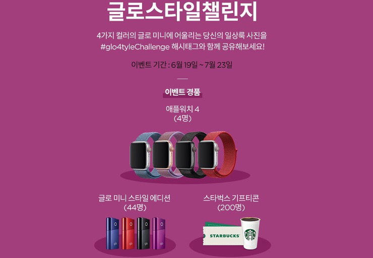 글로 미니와 송재림의 화보 공개와 함께 글로스타일챌린지 이벤트도 진행 중입니다. 레드, 블랙, 블루 그리고 바이올렛 4가지 컬러의 글로 미니와 잘 어울리는 일상룩 사진을 #glo4tylechallenge 해시태그와 함께 공유하면 추첨을 통해 애플워치부터 글로 미니 스타일 에디션 그리고 스타벅스 기프티콘을 받을 수 있습니다.