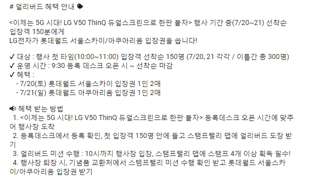 이제는 5G 시대! LG V50 ThinQ 듀얼 스크린으로 한판 붙자 행사에 참여하기 위해선 사전신청이 필수 입니다. 사전신청은 이름과 휴대폰번호 그리고 이메일 주소만 있으면 누구나 참여 가능합니다. 여기서 주목해야 할 한가지! 바로 선착순 150명에게 롯데월드 서울 스카이, 아쿠아리움 입장권을 증정한다는 점입니다.