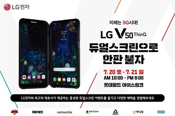 듀얼스크린으로 경험하는 LG V50 ThinQ의 특별함은 7월 20일과 21일 양일간 진행되는 < 이제는 5G 시대! LG V50 ThinQ 듀얼 스크린으로 한판 붙자 > 게임페스티벌에 참여 직접 경험해보시는건 어떨까요? 참여의 경우 사전참여를 하신 분들만 가능한 만큼 서둘러 참여신청하시고 즐거운 시간을 보내시기 바랍니다.