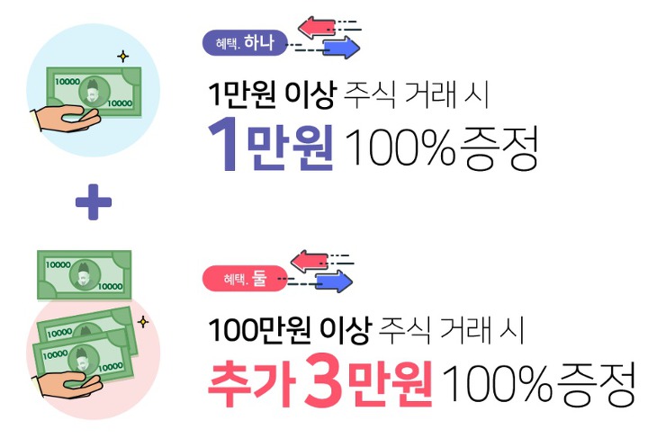 비대면 계좌를 처음 개설한 분들이라면 1만원 이상 주식 거래시 1만원을 100% 증정합니다. 또한 100만원 이상 주식거래를 진행했다면 추가 3만원을 100% 받을 수 있어 100만원 이상 주식거래를 진행했다면 총 4만원의 비용을 받을 수 있습니다.