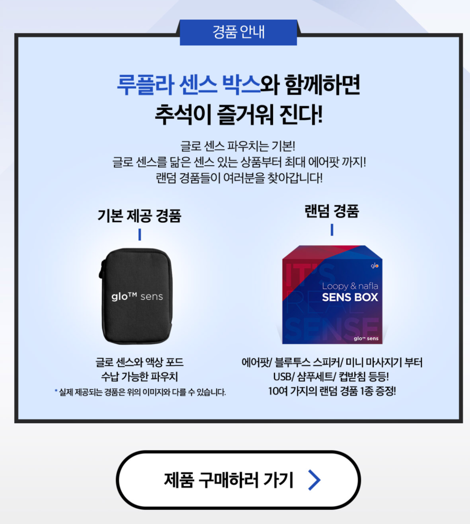 명절 스트레스를 랜덤 경품으로 위로 받을 수 있는 글로 센스 구매 이벤트가 오는 9월 15일까지 진행됩니다. 이벤트 기간 내에 글로센스를 구매하는 전원에게 100% 증정되는 루플레 센스박스! 선착순이 아니라 기간내 구입하는 모든 분들에게 주어지는 만큼 구매를 망설이고 계시는 분들이라면 서둘러 결정하는 것도 좋을 것 같습니다.