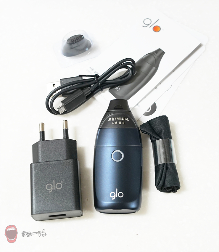 글로 센스 본체를 비롯한 구성품의 경우 충전에 필요한 USB케이블을 비롯해 위생적인 보관을 위한 파우치, 전용 포드 위생마개, 충전어댑터 그리고 사용설명서와 보증서로 구성되어 있습니다. 글로 센스를 사용하는데 있어 필요한 구성품은 모두 있는데요, 기존 글로 제품과 비교했을 때 청소솔 대신 위생 마개가 들어 있는 점은 달라진 부분이라고 할 수 있습니다.
