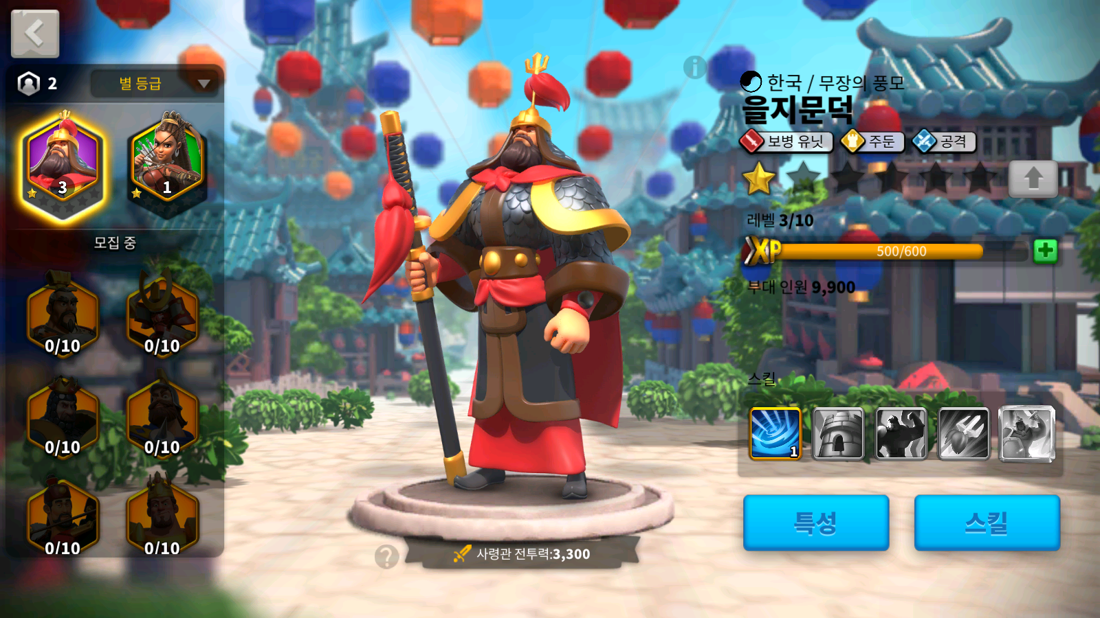 라이즈 오브 킹덤즈의 경우 정통 SLG 장르가 가지고 있는 영토를 성장시키는 재미와 함께 실제 역사 속에 등장하는 영웅을 사령관으로 만나볼 수 있습니다. 한국의 경우 초기 사령관이 을지문덕 장군이 등장하는데요, 조각상을 모아 스킬을 오픈하고 레벨업을 통해 원하는 특성을 업그레이드 하여 더욱 강한 사령관으로 완성할 수 있습니다.