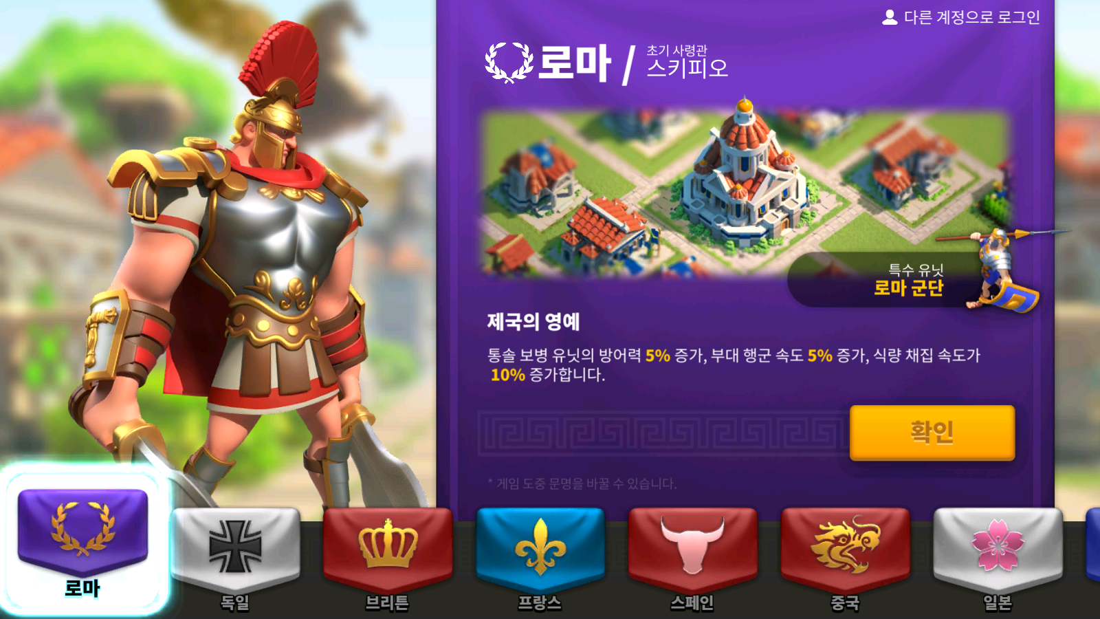라이즈 오브 킹덤즈이 다른 SLG와 다른 차이점은 시작부터 확인 할 수 있습니다. 한국을 비롯한 로마, 독일 브리톤 등 원하는 문명을 선택하여 플레이를 즐길 수 있다는 점입니다. 각 문명의 경우 시작과 동시에 초기 사령관을 획득할 수 있는데요, 아무리 좋은 나라가 많다고 하지만 한국만큼 좋은 나라는 또 없다는 생각에 빠르게 선택 진행해보았습니다.