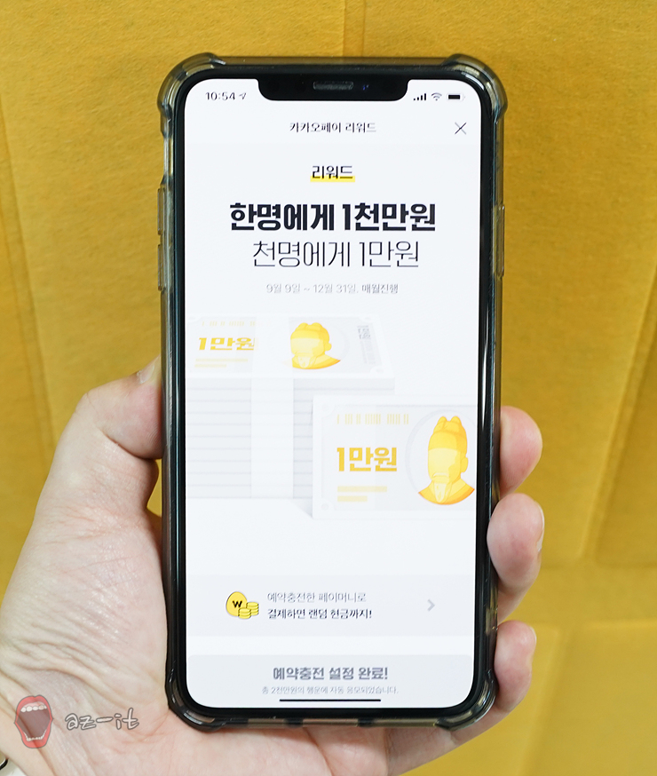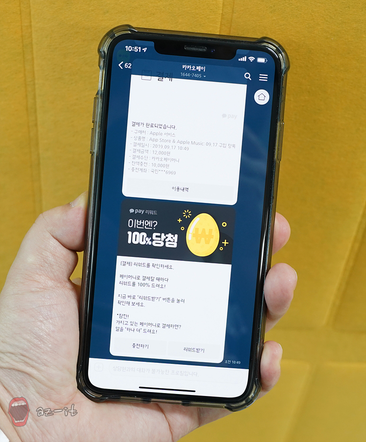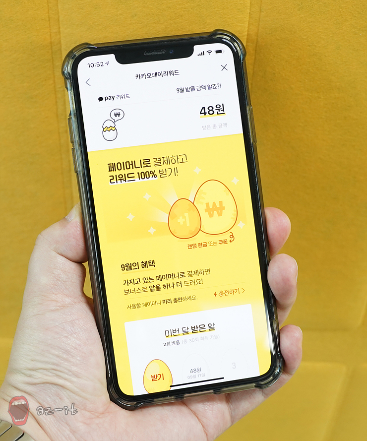 카카오페이를 이용하는데 있어 또 하나 마음에 드는 점. 바로 다양한 프로모션 진행입니다. 미리 충전한 금액으로 결제를 진행하면 추가 보너스 알을 획득하고 그에 따른 결제가 가능합니다. 보너스 알에 들어 있는 리워드가 얼마가 될지 여부는 알을 확인해야만 알 수 있으니 알을 열기전까지 가지는 긴장감도 재미있을 정도입니다.
