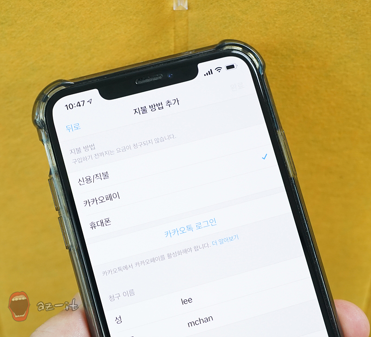 아이템을 구입하기 전 앱스토어 구매 설정이 필요해 카카오페이 결제에 필요한 기본 사항들을 먼저 등록 해두었습니다. 카카오페이 등록 방법의 경우 크게 어렵지 않았는데요, 앱스토어 계정에 접속해 지불방법을 카카오페이로 선택하면 이후 결제는 카카오페이로 진행되는 방식입니다.