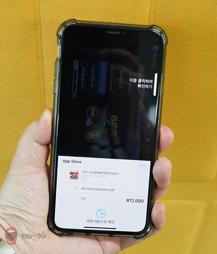 준비된 아이템들 중에서 선택한 건 생체데이터를 30일 동안 매일 20개를 받을 수 있는 패키지였습니다. 보유하고 있는 마블캐릭터들을 성장시키는데 꼭 필요한 아이템인터라 약간의 망설임끝에 구입버튼을 꾹 눌러주었습니다. 카카오페이가 있으니 결제도 번거롭지 않으니 말이죠.