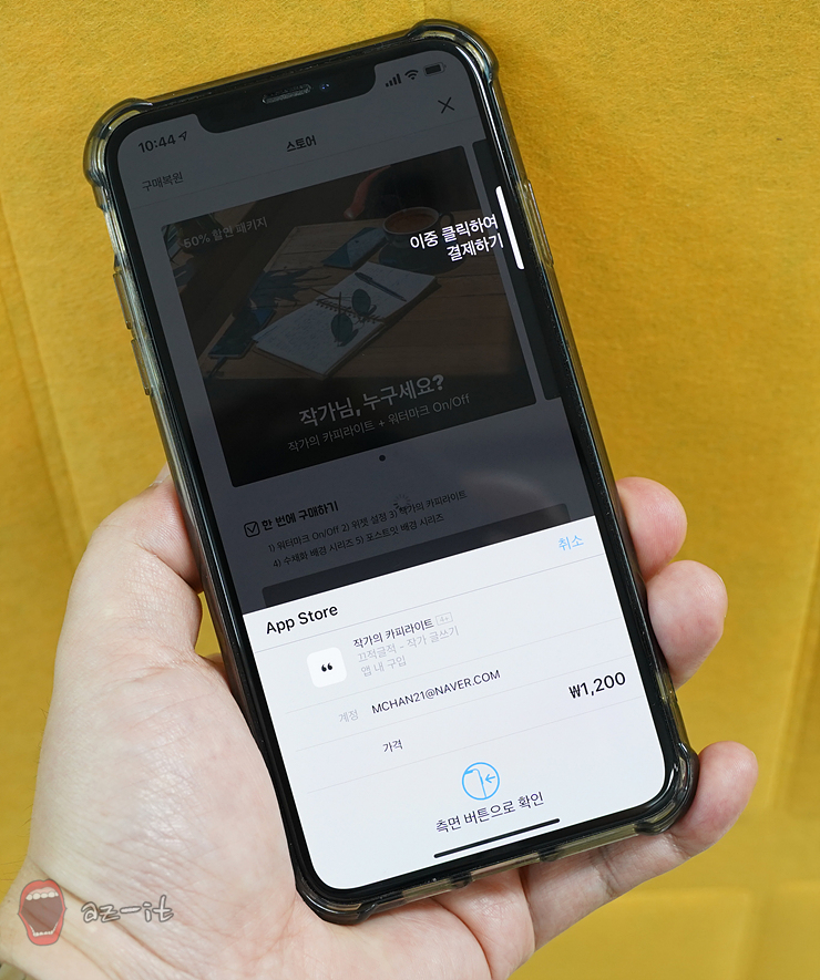 사진에 특별한 글씨를 남길 수 있는 앱에서 마음에 드는 글씨체를 발견 구매도 카카오페이로 결제를 완료했습니다. 이전에는 IOS 앱스토에서 필요한 앱을 결제할 경우 환전수수료에 따른 비용 때문에 적지않은 스트레스도 받았었는데요, 확실히 눈에 보이는 금액만 딱 결제가 되니 환전수수료 같은 추가 비용이나 이로 인한 스트레스도 없어 만족스러웠습니다.