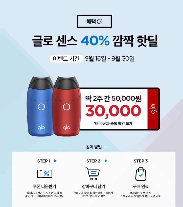 미니멀한 사이즈와 아쉬움없는 배터리. 청소가 필요없는 액상포드를 이용한 점등 일일이 나열하기 어려울 정도로 여러 장점을 가지고 있는 글로센스. 현재 글로센스 MV 200만 달성 40% 할인 이벤트를 놓치면 언제 또 이런 가격으로 만날 수 있을지 모르는 만큼 구매를 고민하고 있는 분들이라면 늦기전에 서둘러 할인쿠폰을 발급받아 구매해 보시기 바랍니다.