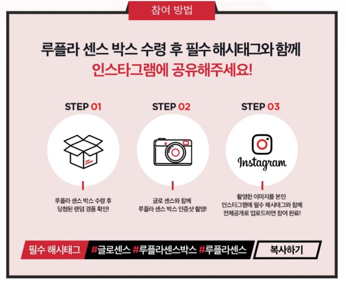 루플라 센스박스 수령후 참여하는 이벤트 방법도 무척 간단합니다. 당첨된 랜덤 경품을 확인한 후 글로센스과 함께 인증샷을 촬영하고 촬영한 이미지를 인스타그램에 필수 해시태그와 함께 전체 공개로 업로드 하면 참여가 완료됩니다. 그리고 루플라 최애템에 당첨되는 행운이 오길 기다리면 이벤트 기간이 끝난 후 결과가 발표됩니다.