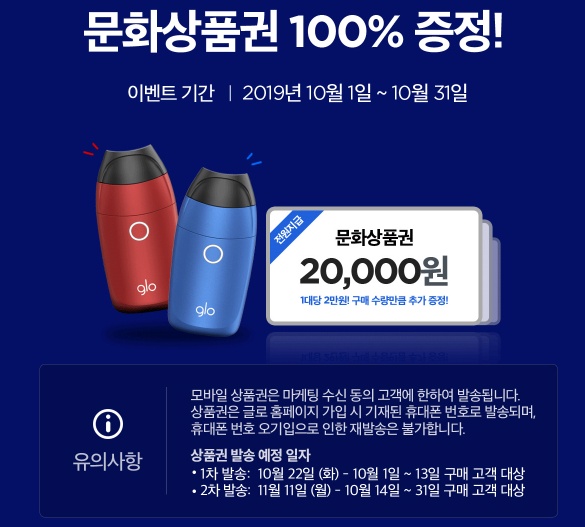 글로센스 구입하고 문화상품권을 받는 이벤트가 진행되는 기간은 오는 10월 31일까지 입니다. 구입한다고 무조건 지급하는 것이 아니라 마케팅 수신 동의 고객에 한해 모바일로 발송되는 만큼 마케팅 수신동의와 모바일 상품권을 받을 휴대폰 번호를 명확하게작성하는 것이 중요합니다.