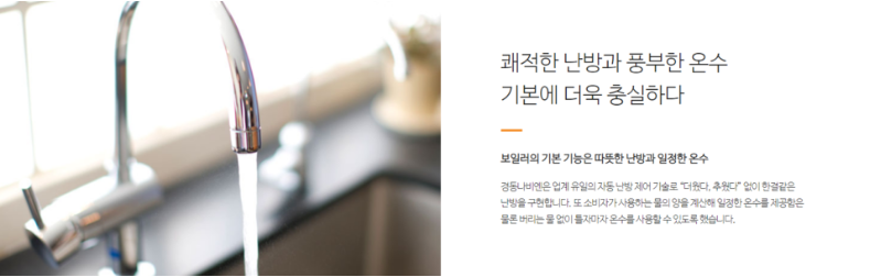 보일러하면 함께 따라오는 난방과 온수에 대해서도 부족함 없는 면모를 보여주고 있습니다. 경동나비엔 콘덴싱보일러는 업계 유일 자동 난방 제어기술을 가지고 있어 온도차이가 크지 않은 한결같은 난방을 구현합니다. 뿐만 아니라 사용하는 물의 양을 계산해 일정한 온수를 제공하며, 물을 버리는 일 없이 틀자마다 온수를 사용할 수 있어 특별함을 더해주고 있기도 합니다.
