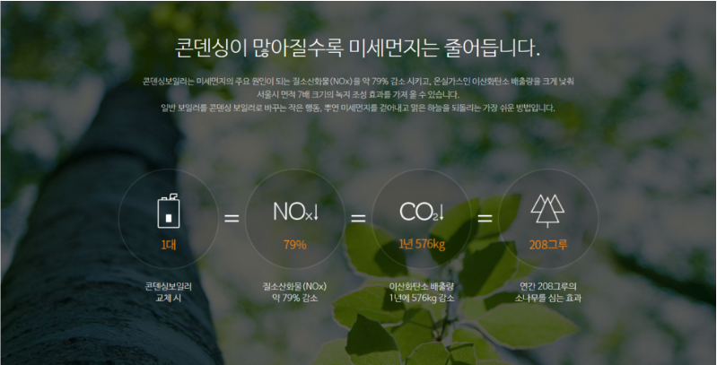 이산화탄소를 절감하는 것 만으로도 연간 208그루의 소나무를 심는 것과 동일한 효과를 내는 부분은 이번 친환경 콘덴싱보일러의무화를 시작하는 큰 이유이기도 한데요, 온실가스로 인해 지구온난화에 대한 심각함이 대두되는 지금 가정에서 손쉽게 할 수 있는 환경보호의 일환이 아닐까 생각됩니다.