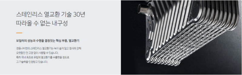 경동 친환경콘덴싱보일러의 경우 스테인레스 열 교환기를 사용해 녹슬지 않고 침식에 강한 장점을 가지고 있어 오랬동안 잔고장 없이 사용 가능한 내구성을 자랑하고 있습니다. 더욱이 국내 최초 유럽에 열교환기를 수출했을 정도로 스테인리스 열교환 기술에 있어서는 최고라고 자부할 수 있을 정도 입니다.
