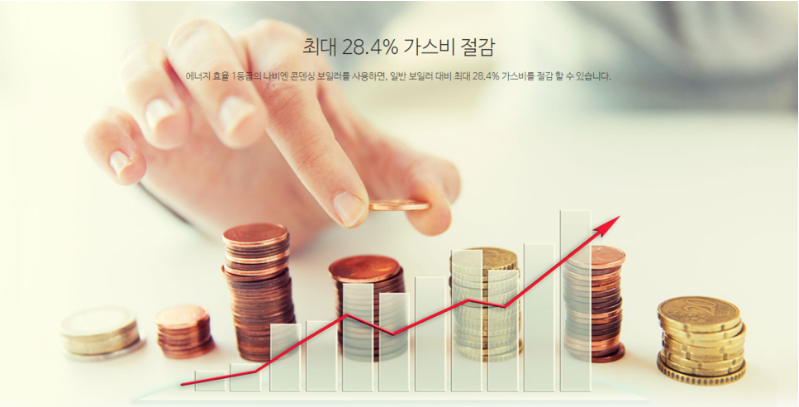 실제 사용하는 입장에서도 여러 장점이 적용합니다. 우선 비용적인 부분에 있어서도 절감효과를 볼 수 있는데요, 에너지효율 1등급의 나비엔 콘덴싱보일러를 사용할 경우 일반보일러와 비교했을 때 최대 28.4%의 가스비를 절약할 수 있어 생활비를 아끼는데 큰 도움을 받을 수 있기도 합니다.