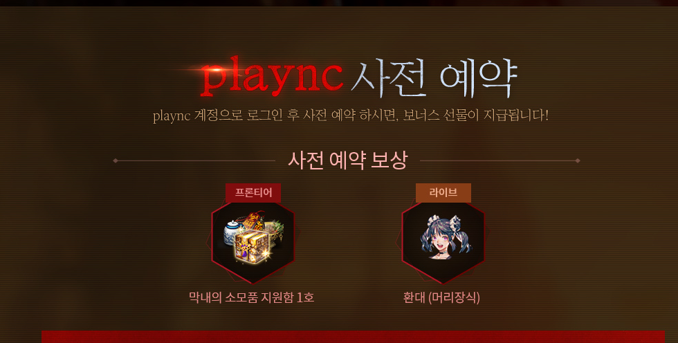 사전예약의 경우 플레이엔씨 계정으로 로그인후 진행하면 추가 선물을 받을 수 있습니다. 막내의 소모품지원함 1호와 머리장식 환대를 받을 수 있는만큼 놓치기 아쉬운 부분입니다. 사전예약 하힐 때 플레이엔씨 계정으로 접속 보너스 선물도 놓치면 안될 것 같습니다.