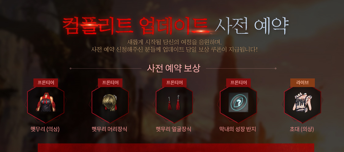 온라인게임 블레이드앤소울 컴플리트 업데이트를 앞두고 사전예약이 시작되었습니다. 사전예약 선물로 햇무리 의상과 머리장식과 얼굴장식 그리고 막내의 성장반지와 초대 의상이 준비되어 있습니다. 이번 사전예약은 업데이트 전까지 진행되며 업데이트 당일 보상 쿠폰을 받을 수 있습니다.