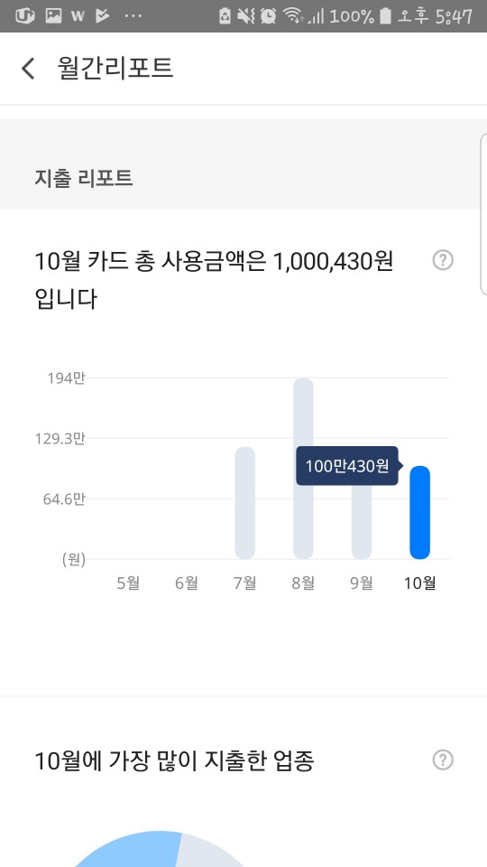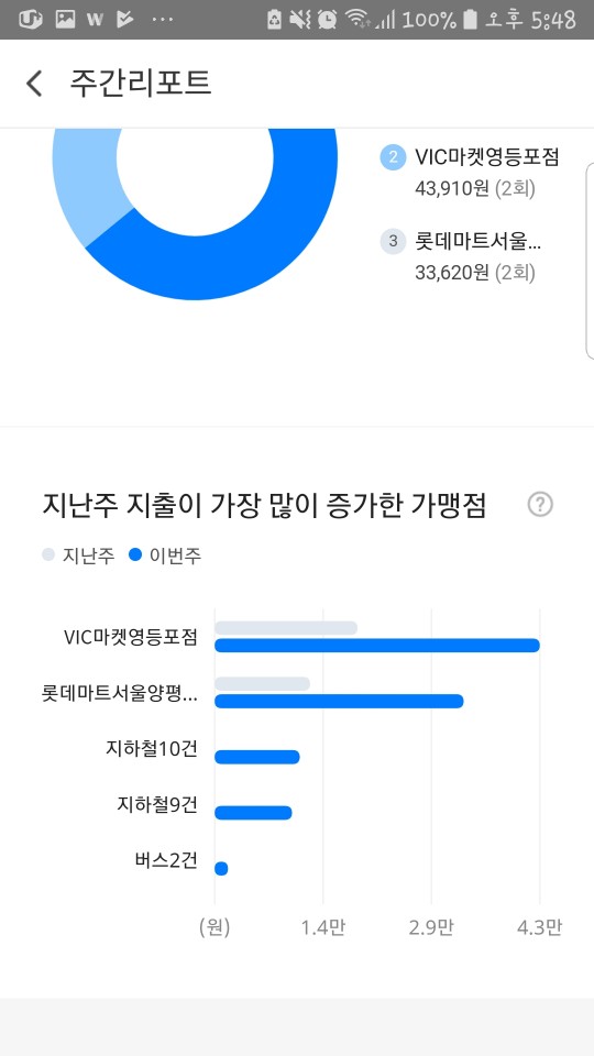 뿐만 아니라 주간, 월간으로 총 사용한 금액에 대한 리포팅을 해주니 소비패턴에 대한 인지가 빠르게 되어 놀랄 정도였습니다.