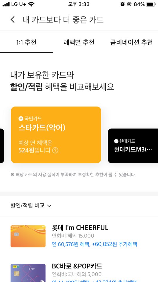 소비패턴에 따라 현재 사용하는 카드보다 할인이라던가 적립을 더 해주는 카드를 제시해 주기도 합니다. 같은 비용을 지출할 요량이라면 받을 수 있는 혜택을 더 받는게 여러모로 유용하니 말이죠. 비용이 얼마 차이 안나는 것 같지만 월,연단위로 넘어가면 무시할 수 없을 정도가 될 정도랍니다.