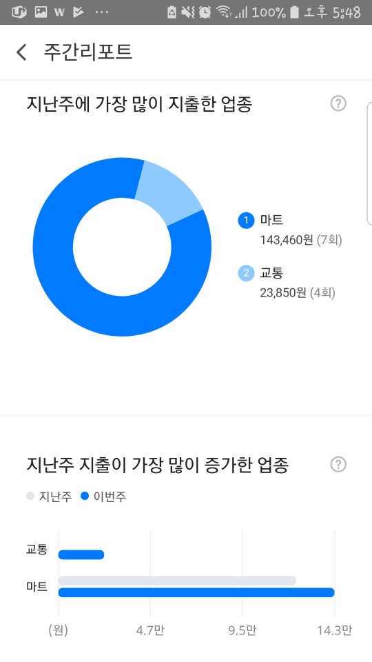주간리포트를 보고 있으니 지난주 내가 무얼 했는지, 어디서 지출이 증가했는지 여부를 보고 미처 기억에 남지 않았던 소비가 생각 날 정도였습니다. 주간리포트가 필요할까 싶었지만, 월단위로 정리하고 고민하기 전에 주차별로 확인하고 관리하다 보면 불필요한 소비도 자연스럽게 줄어 들 수 있다는 생각에 더욱 부지런해져야겠구나 싶은 생각이 들었을 정도입니다.