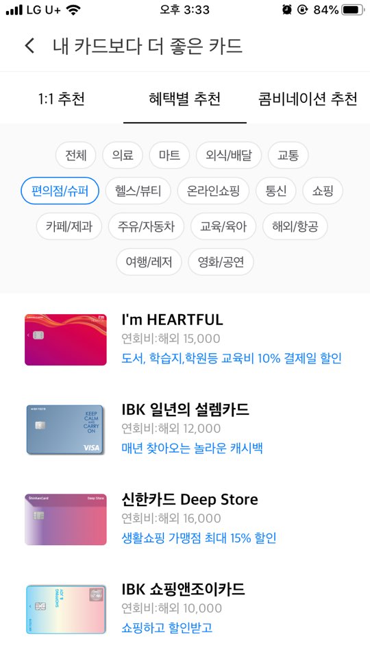 소비 패턴도 파악해주고, 더 많은 혜택과 적립을 받을 수 있는 쿠폰과 멤버십을 추천해주기도 합니다. 쿠폰을 추천해 주는것도 마구잡이가 아니라 항상 가는곳에서 사용 가능한 쿠폰을 추천해주더라구요. 덕분에 할인도 받고 필요한 물건도 구입하고 조금이라도 돈을 아끼는데 도움이 되니 이보다 더 좋을까 싶은 생각이 들었습니다.