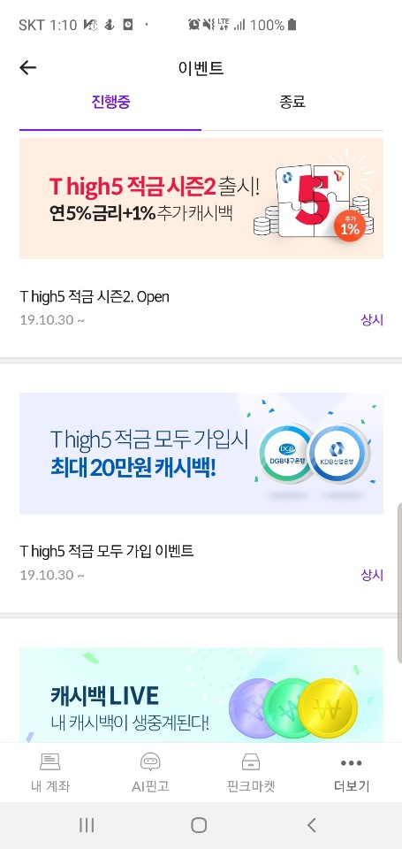 핀트적금에서는 높은 금리를 지급하는 적금상품 외에도 다양한 이벤트가 준비되어 있습니다. T high5 적금 모두 가입시 최대 20만원 캐시백을 받을 수 있는 것 외에 캐시백 LIVE 이벤트로 핀크 앱을 통한 연락처 송금, T전화 앱을 통한 송금, 핀크카드 결제, SK pay 등 세가지 금융 서비스를 이용할 때 마다 캐시백 혜택이 쌓이는데요, 매 50번재 거래 당첨자는 10%캐시백이 제공된다고 하니 핀트적금를 통해 고금리적금도 가입하고 추가적인 캐시백도 챙겨보시기 바랍니다.