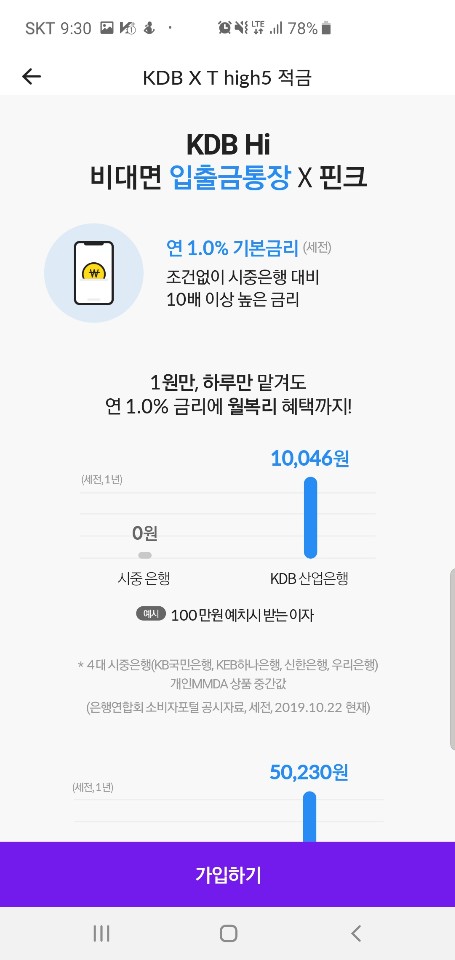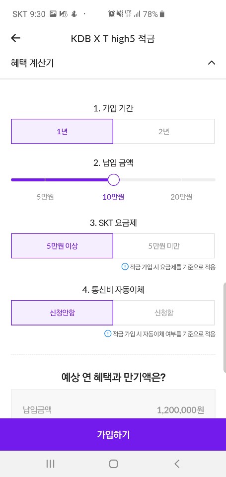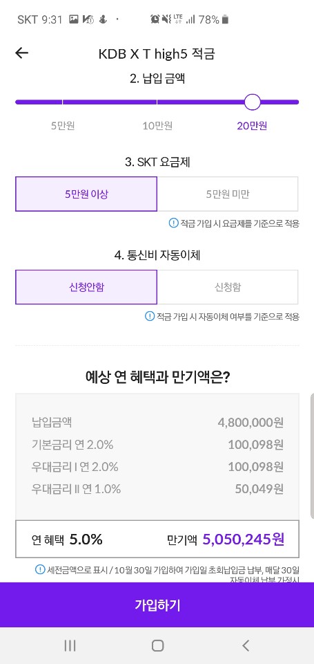 핀트 T high5 적금의 경우 만 17세 이상 SKT고객이라면 가입 할 수 있습니다. 연 2.0% 기본금리를 바탕으로 KDE산업은행 마케팅 활용 동의 및 만기까지 SKT회선을 유지하면 2% 추가 우대금리를 받을 수 있습니다. 여기에 또 하나! 적금 만기까지 SKT5만원이상 요금제 이용 또는 통신비 자동이체를 유지하면 연 1% 우대금리가 적용됩니다.