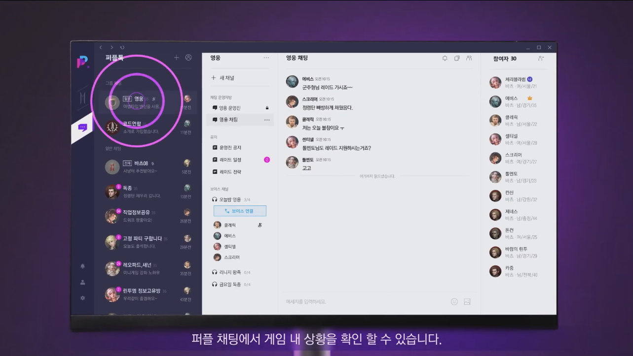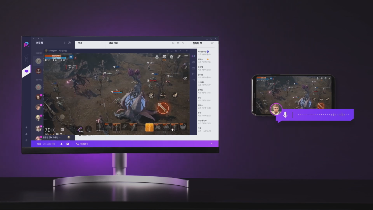 리니지2M하면 빼 놓을 수 없는 필드쟁은 무엇보다 혈맹원 또는 같은 라인들과 소통이 중요한데요, 순간의 긴박함을 채팅으로 하기에는 아쉬운 점들이 있습니다. 때문에 보이스앱을 사용하는 경우가 많은데요, 퍼플만 있으면 플레이부터 시작해 소통까지 하나로 모든 것이 해결되어 편리할 것 같습니다.