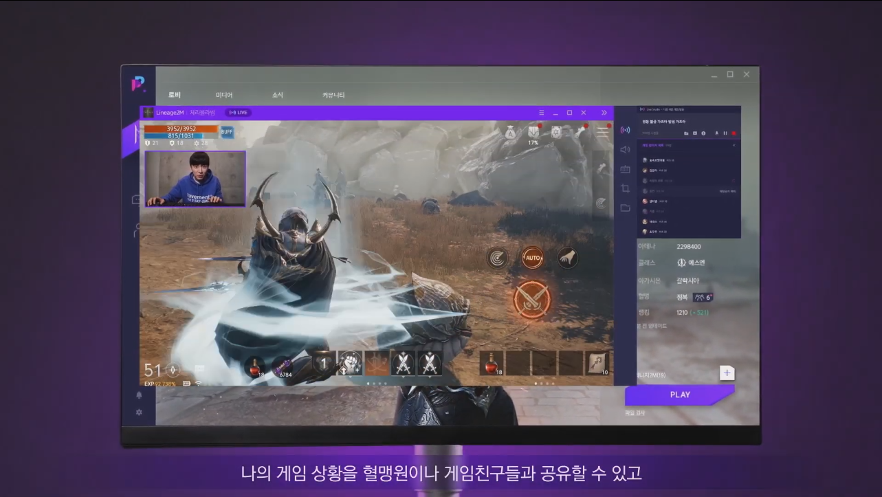 퍼플의 경우 스트리밍 기능을 통해 혈맹원의 화면을 직접 보면서 함께 소통하는 것도 가능합니다. 퍼플 존에서 스트리밍 버튼만 클릭하면 간단한 방송설정도 가능해 쉽고 빠르게 라이브 방송이 시작되는데요, 혈맹원들의 경우 실시간 방송되고 있는 화면을 보면서 라이브채팅도 즐길 수 있습니다.