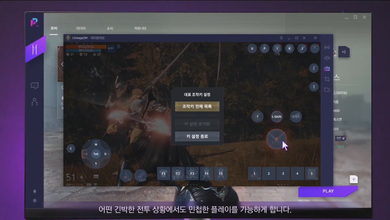 모바일로 즐기는 게임을 앱플레이로 즐기다 보면 컨트롤에 대한 아쉬움이 남기 마련입니다. 퍼플은 기존 앱플레이어가 가지고 있는 가상키 조작방식을 넘어 리니지2M만의 조작시스템을 도입해 인풋렉 없는 정확하고 민첩한 플레이를 즐길 수 있습니다.