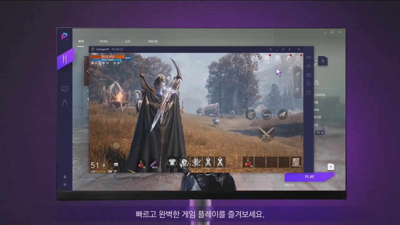 퍼플을 통해 즐기는 리니지2M은 4K UHD급 그래픽 구현이 가능해 PC 자체 리소스를 활용하여 단순히 보여주는 것이 아니라 에뮬레이터 대비 높은 퍼포먼스를 제공하는 것이 특징입니다. 기존 앱플레이어의 그래픽이 모바일로 즐기는 것과 차이가 있다면 퍼플의 경우 그래픽에 대한 아쉬움은 없을 듯 보입니다.