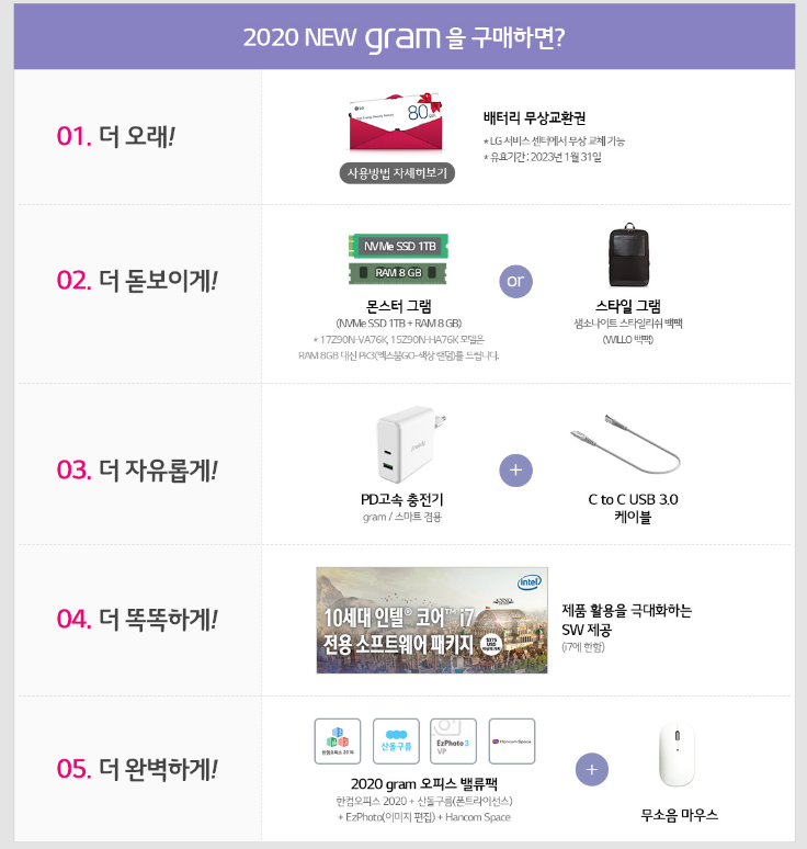 예약판매 기간 내에 LG그램 17 2020 노트북을 구입하고 등록한 분들에게는 배터리 무상교환권을 비롯해 샘소나이트 스타일리쉬 백팩이나 SSD 1TB & RAM 8G 중 하나를 선택하여 받을 수 있고, 고속 충전기와 USB 케이블 그리고 I7 에 한해 전용 소프트웨어 패키지를 제공합니다. 여기에 2020 그램 오피스 밸류팩과 무소음 마우스까지 받을 수 있습니다.