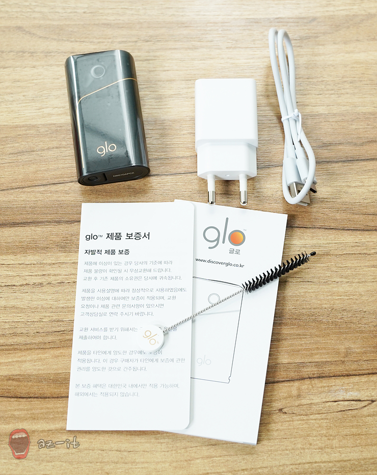 우선 구성품을 살펴보면 글로 프로 본체와 충전을 위해 필요한 케이블과 보증서 그리고 간단한 사용설명서와 함께 청소에 필요한 청소솔까지 필요한 모든것을 갖추고 잇습니다.