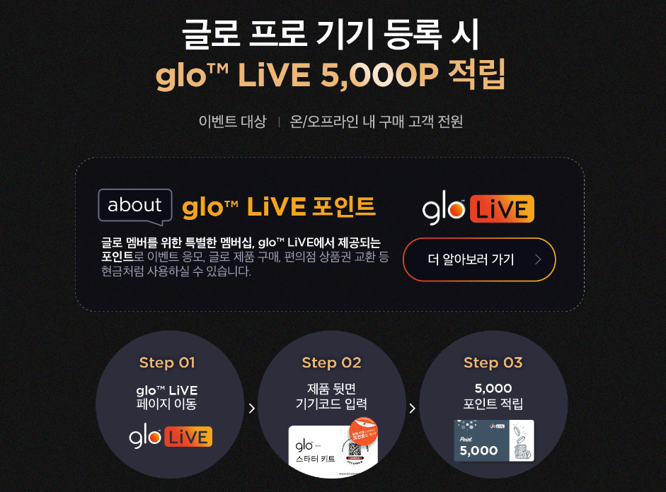 구입단계에서 할인 혜택을 받았다면 기기 등록과 함께 글로 라이브 포인트 5천점을 획득할 수 있습니다. 글로 포인트의 경우 이벤트 응모나 제품구매를 비롯해 편의점 상품권 교환등 현금처럼 사용할 수 있어 추후 여러가지 용도로 활용이 가능합니다.
