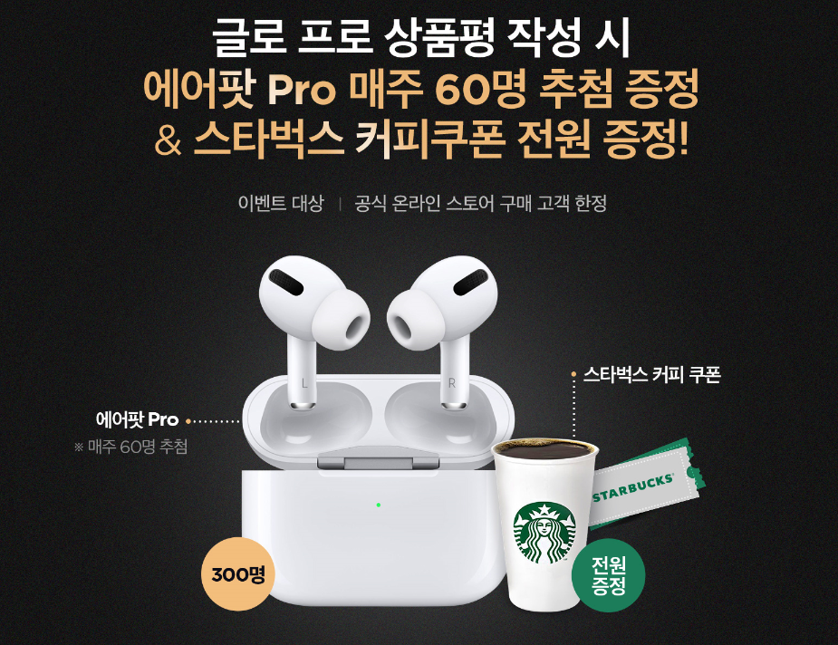 글로 프로를 구입하고 상품평을 작성하면 스타벅스 커피 쿠폰을 전원에게 증정하는 것을 비롯해 매주 60명을 추첨해 총 300명에게 에어팟Pro를 선물로 지급합니다. 단 공식 온라인 스토어를 통해 구매한 분들에 한해 선물을 증정한다고 하니 구입을 망설이고 계셨던 분들이라면 서둘러 참여 주어지는 모든 혜택을 누려보시기 바랍니다.