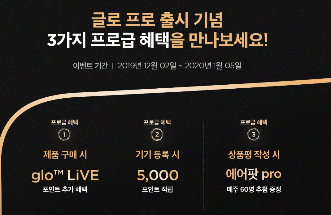 글로 프로 출시기념 온라인 한정 할인 이벤트가 오는 1월 5일까지 진행됩니다. 제품 구매시 글로 라이브 포인트 추가혜택부터 기기등록시 5천포인트 적립 그리고 상품평을 작성한 분들중 매주 추첨을 통해 60명에게 에어팟 pro를 증정하는 이벤트가 진행 됩니다.