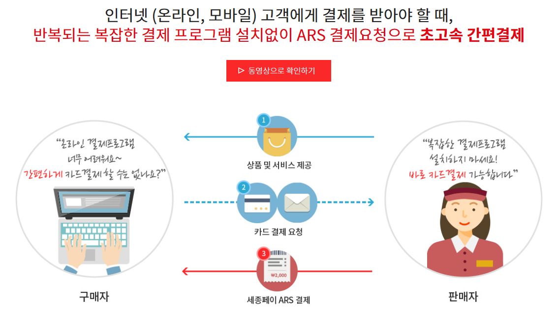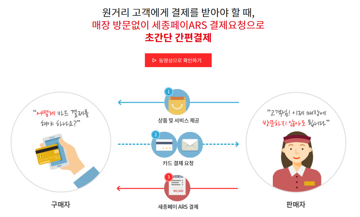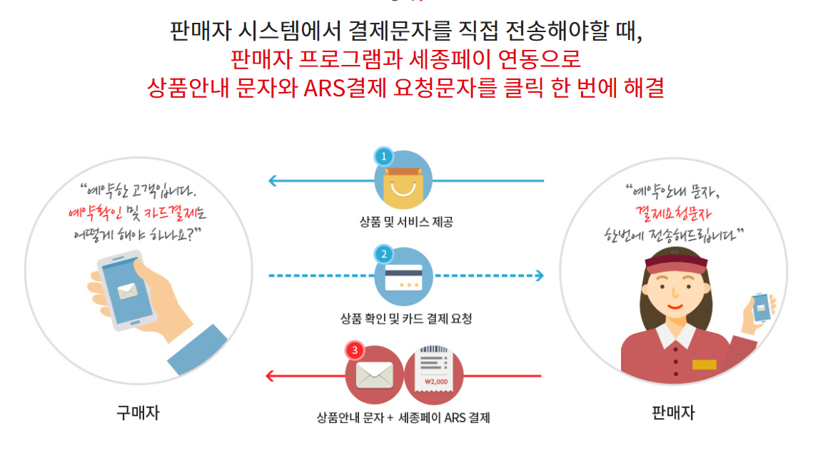 매장에서 필요한 물건을 전화 또는 온라인 문의로 구입시 진행되는 상황에서도 매장 방문 없이 세종페이 ARS 결제요청을 통해 간단하게 처리 할 수 있습니다. 구매자 입장에서는 필요한 물건을 매장 방문없이 구매 가능하고, 판매자 입장에선 손님을 놓치지 않고 매출을 올릴 수 있는 중요한 방법이기도 합니다.