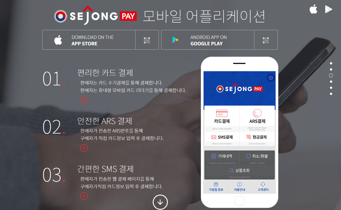 세종페이 결제의 경우 모바일 어플리케이션으로 보다 간편한 결제가 가능합니다. 카드 수기 결제나 모바일 카드 리더기를 통한 결제가 가능한 카드결제 부터, 판매자가 전송한 ARS번호를 통해 진행되는 결제 또한 판매자가 전송한 웹 결제 피이지를 통해 구매자가 직접 카드 정보를 입력한 후 결제 되는 방식입니다.