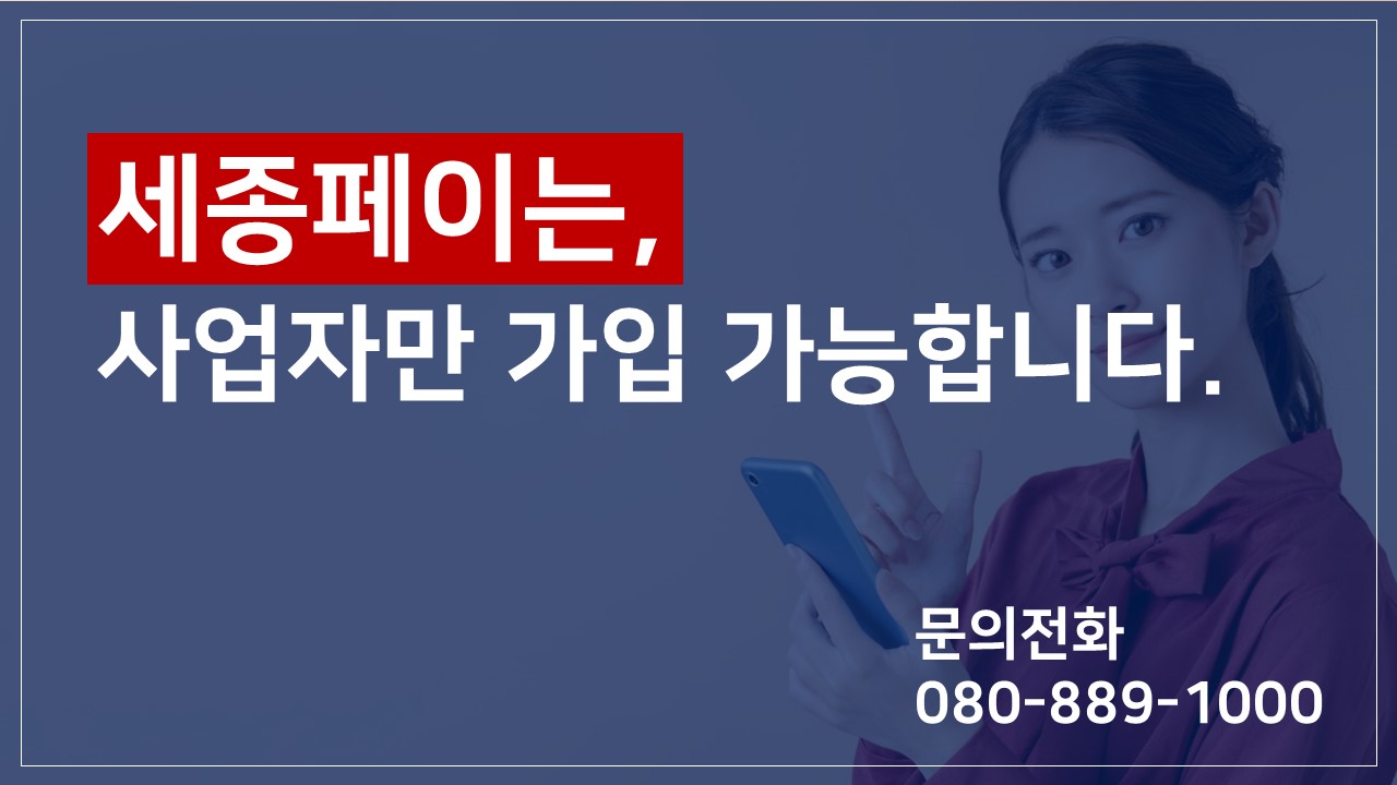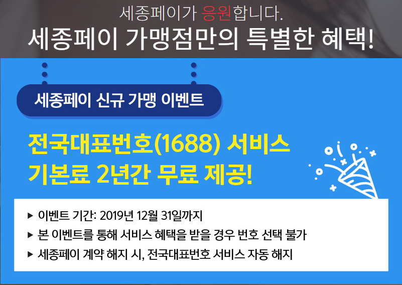 판매자의 편의를 위한 결제방식으로 구매자까지 편리한 간편결제 서비스 세종페이. 현제 신규 가맹 이벤트가 진행 중입니다. 오는 12월 31일까지 신규 가입한 가맹점들에게는 전국 대표번호 서비스를 2년동안 무료로 제공하고 있다고 하니 이번 기회를 놓치지 마시고 보다 간편하고 안전하면서 편리한 세종페이를 사용해보시길 바랍니다.